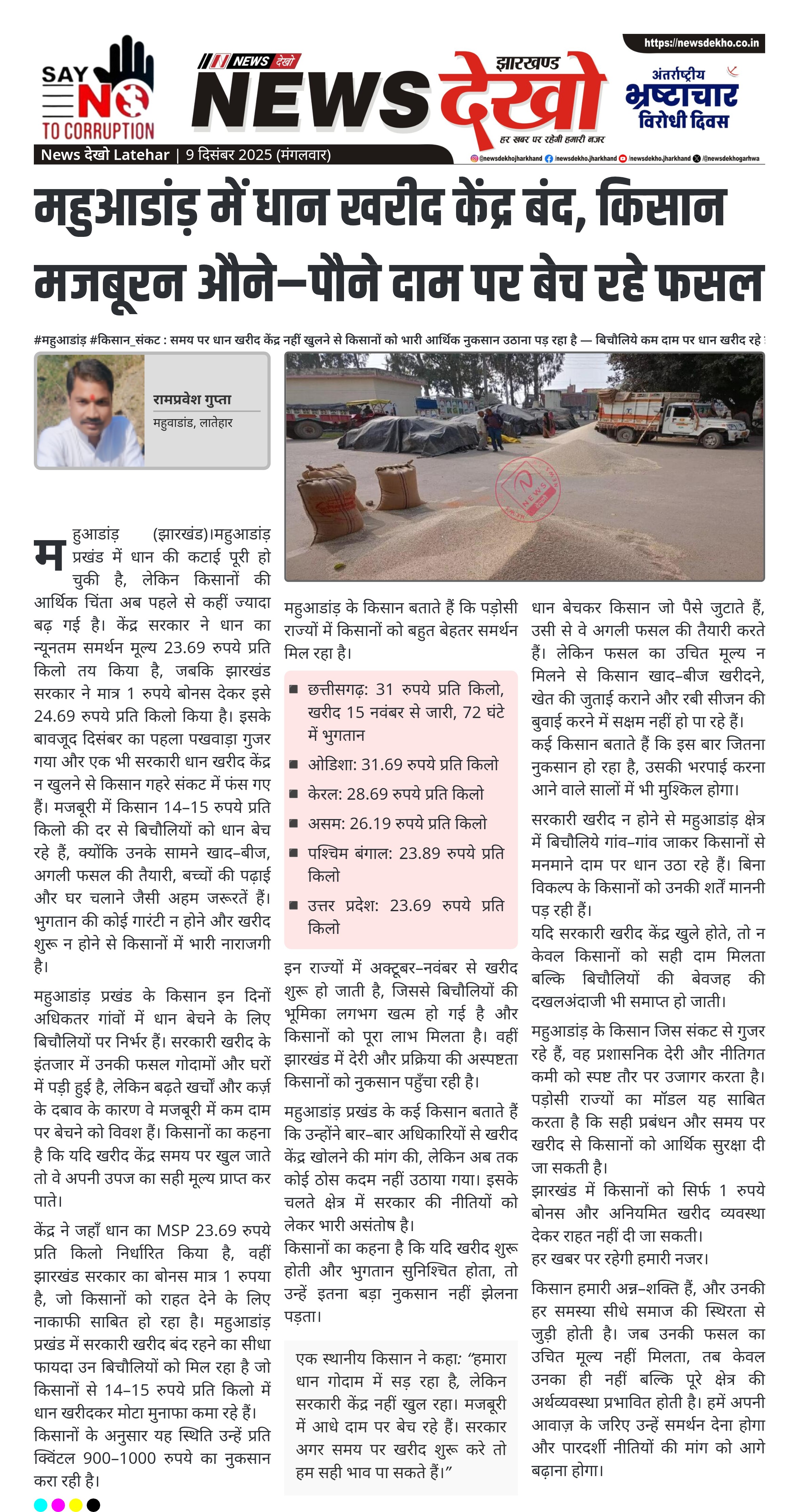 #महुआडांड़ #किसान_संकट : समय पर धान खरीद केंद्र नहीं खुलने से किसानों को भारी आर्थिक नुकसान उठाना पड़ रहा है — बिचौलिये कम दाम पर धान खरीद रहे हैं। महुआडांड़ प्रखंड में दिसंबर के मध्य तक एक भी सरकारी धान क्रय केंद्र नहीं खुला। MSP 23.69 रुपये, झारखंड का बोनस जोड़कर 24.69 रुपये प्रति किलो, लेकिन किसानों को मिल रहे हैं सिर्फ 14–15 रुपये। पड़ोसी राज्यों में 31 रुपये तक धान खरीद और 72 घंटे में भुगतान, जिससे किसानों को…