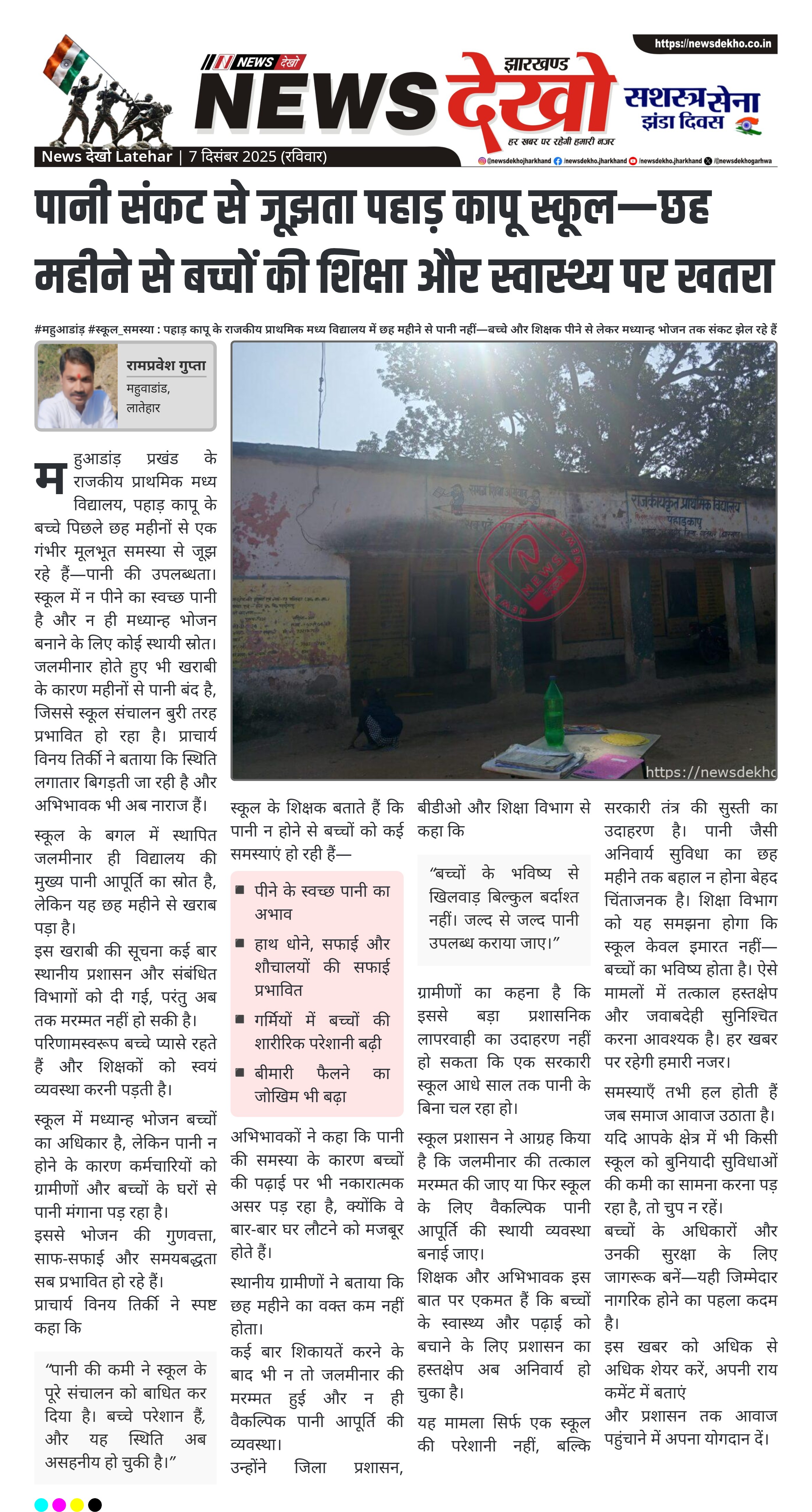 #महुआडांड़ #स्कूल_समस्या : पहाड़ कापू के राजकीय प्राथमिक मध्य विद्यालय में छह महीने से पानी नहीं—बच्चे और शिक्षक पीने से लेकर मध्यान्ह भोजन तक संकट झेल रहे हैं। राजकीय प्राथमिक मध्य विद्यालय, पहाड़ कापू में छह महीने से पानी बंद। स्कूल के पास की जलमीनार खराब, पानी आपूर्ति पूरी तरह ठप। मध्यान्ह भोजन घरों से पानी मंगाकर बन रहा। बच्चों की पढ़ाई, स्वास्थ्य और स्वच्छता गंभीर रूप से प्रभावित। प्राचार्य विनय तिर्की ने समस्या को प्रशासन तक पहुंचाया। अभिभावकों ने…