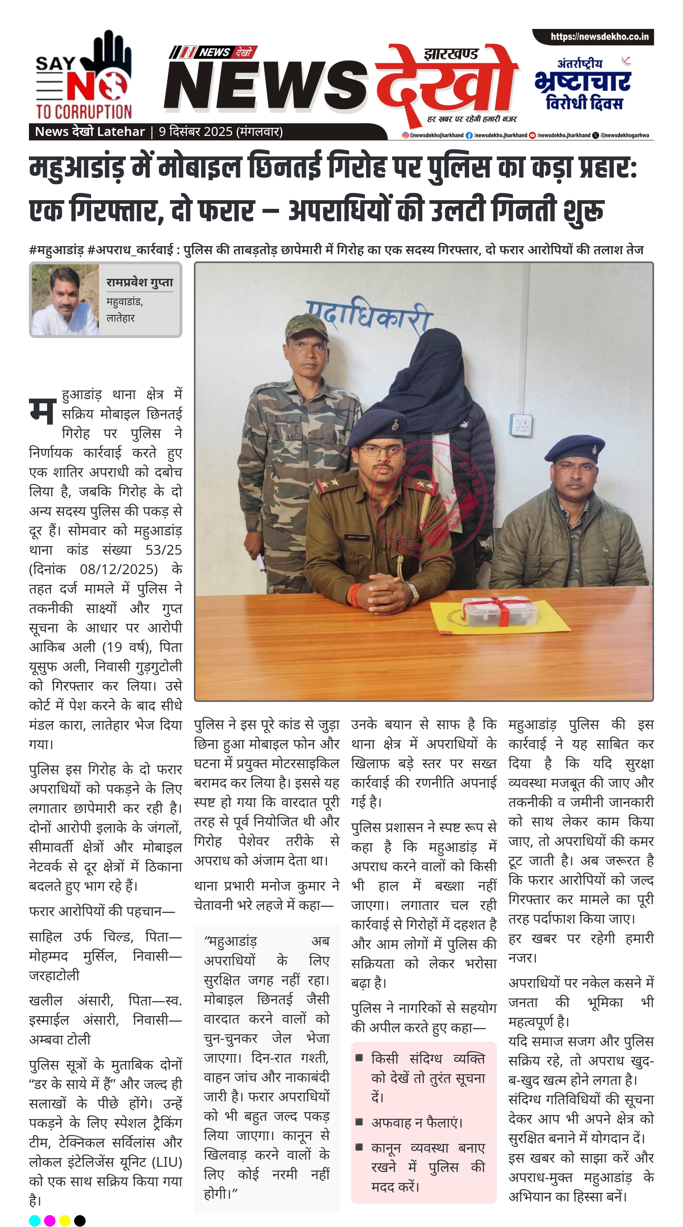#महुआडांड़ #अपराध_कार्रवाई : पुलिस की ताबड़तोड़ छापेमारी में गिरोह का एक सदस्य गिरफ्तार, दो फरार आरोपियों की तलाश तेज मोबाइल छिनतई गिरोह पर पुलिस की बड़ी कार्रवाई। आकिब अली गिरफ्तार, सीधे न्यायिक हिरासत में भेजा गया। साहिल उर्फ चिल्ड और खलील अंसारी अब भी फरार—पकड़ने के लिए विशेष अभियान जारी। मोटरसाइकिल व छिना गया मोबाइल बरामद, गिरोह की साजिश का खुलासा। थाना प्रभारी मनोज कुमार का चेतावनी भरा संदेश—अपराधियों के लिए महुआडांड़ अब सुरक्षित नहीं। महुआडांड़ थाना क्षेत्र में सक्रिय…