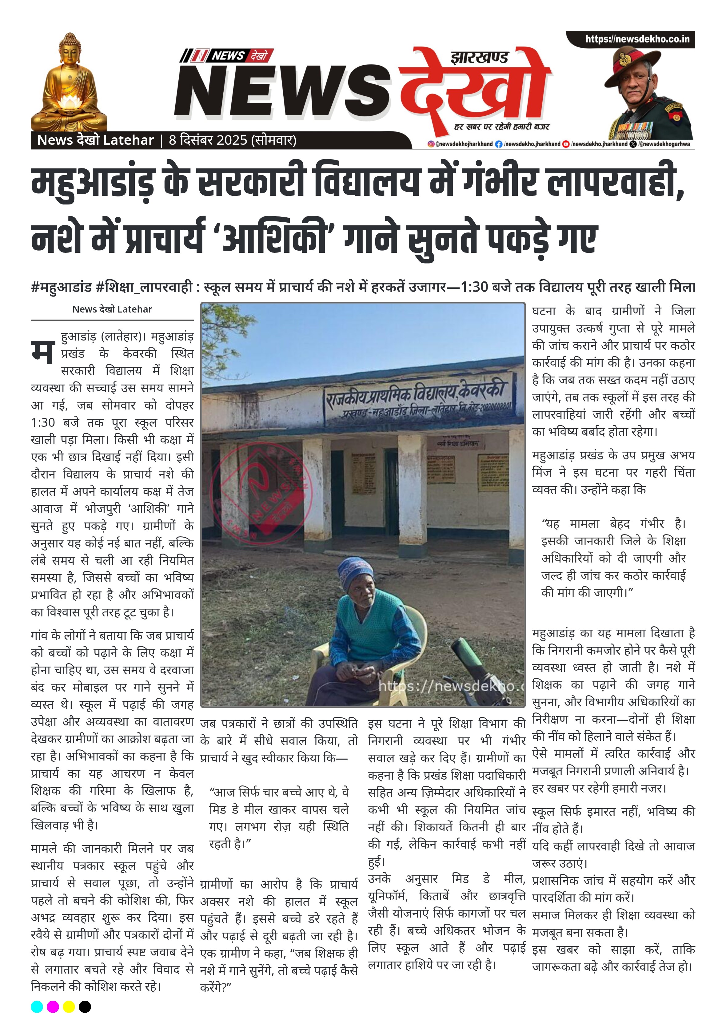 #महुआडांड #शिक्षा_लापरवाही : स्कूल समय में प्राचार्य की नशे में हरकतें उजागर—1:30 बजे तक विद्यालय पूरी तरह खाली मिला सरकारी विद्यालय 1:30 बजे तक पूरी तरह खाली, बच्चे नदारद। प्राचार्य नशे में मोबाइल पर तेज आवाज में गाने सुनते मिले। पत्रकारों से अभद्र व्यवहार, सवालों से बचते रहे। प्राचार्य ने स्वीकारा—“सिर्फ चार बच्चे आए थे, रोज़ यही स्थिति।” ग्रामीणों ने डीसी से जांच और कड़ी कार्रवाई की मांग की। महुआडांड़ (लातेहार)। महुआडांड़ प्रखंड के केवरकी स्थित सरकारी विद्यालय में शिक्षा…