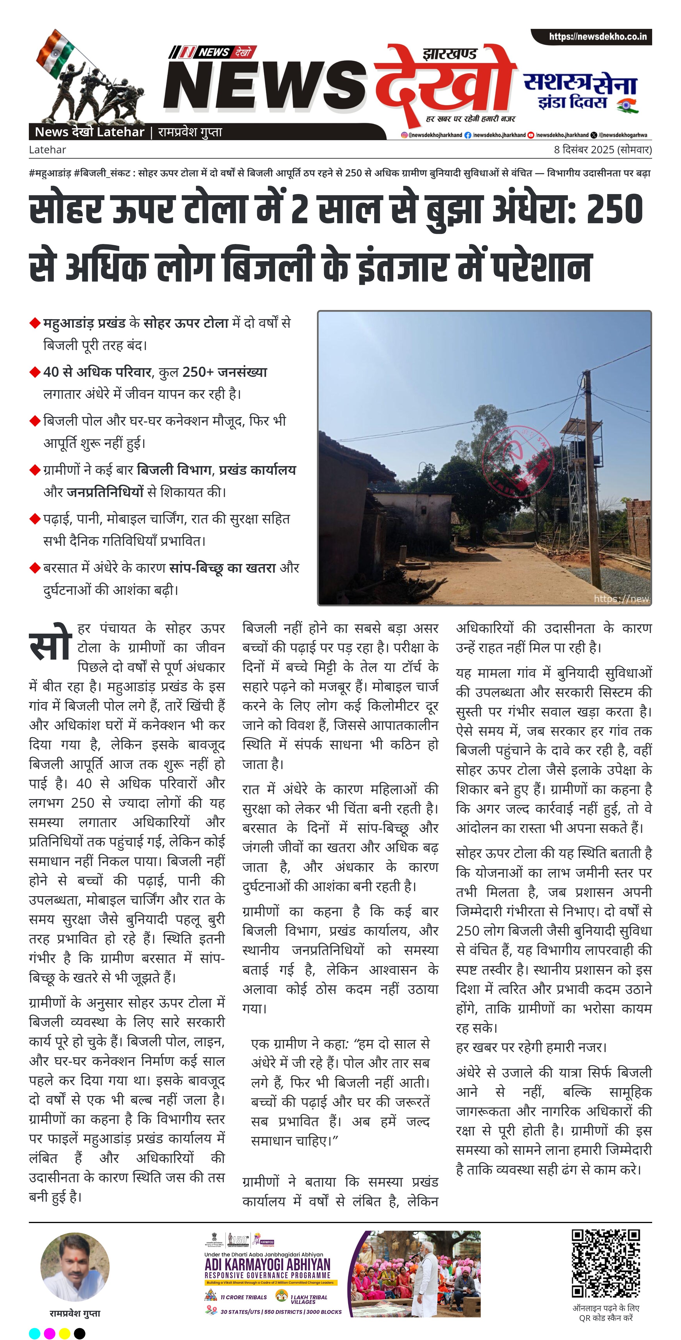 #महुआडांड़ #बिजली_संकट : सोहर ऊपर टोला में दो वर्षों से बिजली आपूर्ति ठप रहने से 250 से अधिक ग्रामीण बुनियादी सुविधाओं से वंचित — विभागीय उदासीनता पर बढ़ा आक्रोश महुआडांड़ प्रखंड के सोहर ऊपर टोला में दो वर्षों से बिजली पूरी तरह बंद। 40 से अधिक परिवार, कुल 250+ जनसंख्या लगातार अंधेरे में जीवन यापन कर रही है। बिजली पोल और घर-घर कनेक्शन मौजूद, फिर भी आपूर्ति शुरू नहीं हुई। ग्रामीणों ने कई बार बिजली विभाग, प्रखंड कार्यालय और जनप्रतिनिधियों…