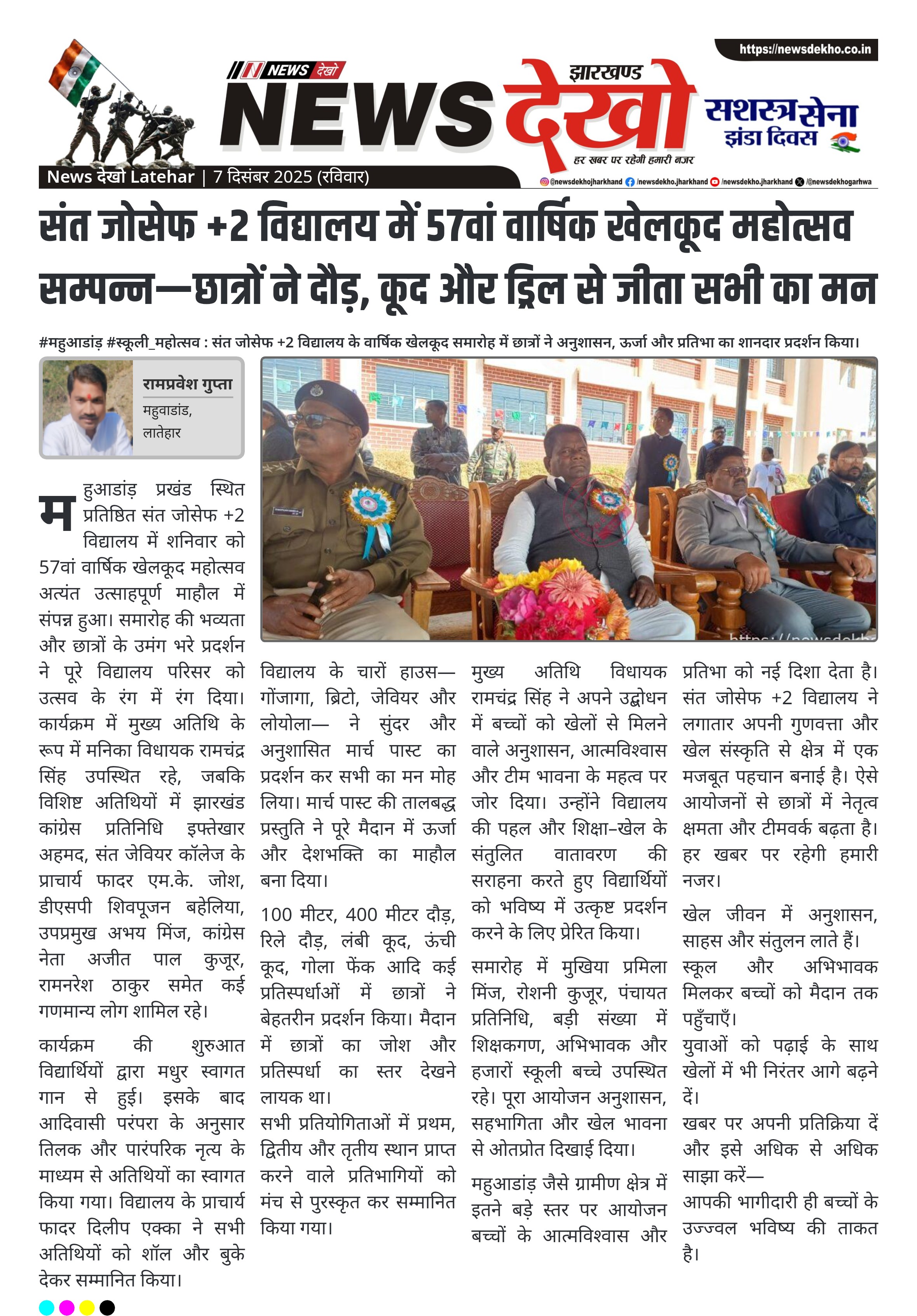 #महुआडांड़ #स्कूली_महोत्सव : संत जोसेफ +2 विद्यालय के वार्षिक खेलकूद समारोह में छात्रों ने अनुशासन, ऊर्जा और प्रतिभा का शानदार प्रदर्शन किया। 57वां वार्षिक खेलकूद महोत्सव उत्साहपूर्वक सम्पन्न। मुख्य अतिथि विधायक रामचंद्र सिंह सहित कई गणमान्य उपस्थित। चारों हाउस का आकर्षक मार्च पास्ट और रंगारंग ड्रिल। 100 मीटर, रिले, लंबी–ऊंची कूद सहित कई स्पर्धाएँ आयोजित। विजेता छात्रों को मंच से पुरस्कृत कर सम्मानित किया गया। महुआडांड़ प्रखंड स्थित प्रतिष्ठित संत जोसेफ +2 विद्यालय में शनिवार को 57वां वार्षिक खेलकूद महोत्सव…