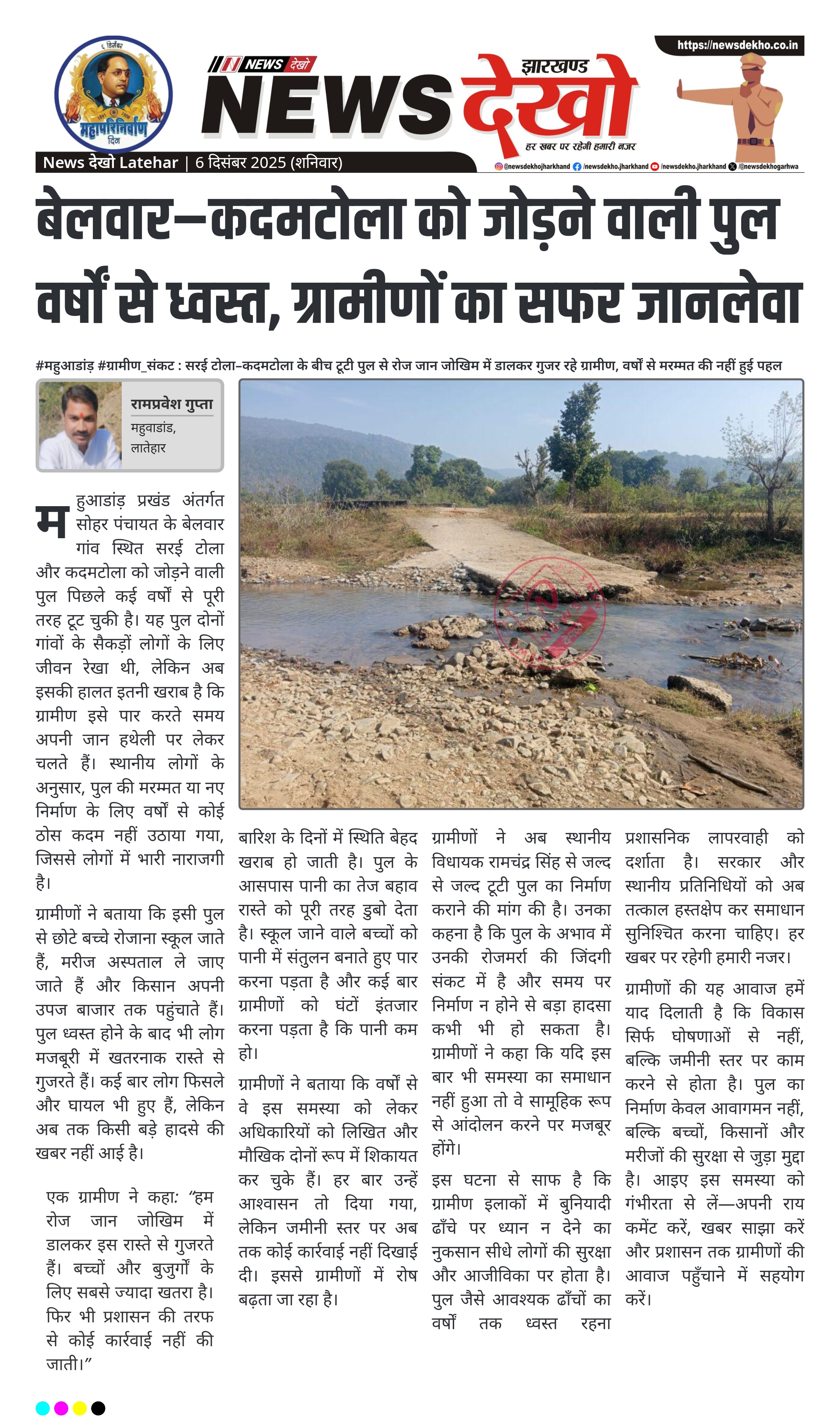 #महुआडांड़ #ग्रामीण_संकट : सरई टोला–कदमटोला के बीच टूटी पुल से रोज जान जोखिम में डालकर गुजर रहे ग्रामीण, वर्षों से मरम्मत की नहीं हुई पहल महुआडांड़ प्रखंड के सोहर पंचायत के बेलवार–सरई टोला और कदमटोला को जोड़ने वाली पुल वर्षों से ध्वस्त पड़ी है। टूटी पुल से बच्चे, मरीज, किसान और ग्रामीण रोजाना जोखिम उठाकर गुजरने को मजबूर। बरसात में पुल क्षेत्र में तेज बहाव से रास्ता पूरी तरह डूब जाता है, हादसे का खतरा दोगुना। ग्रामीणों ने बताया कि…
