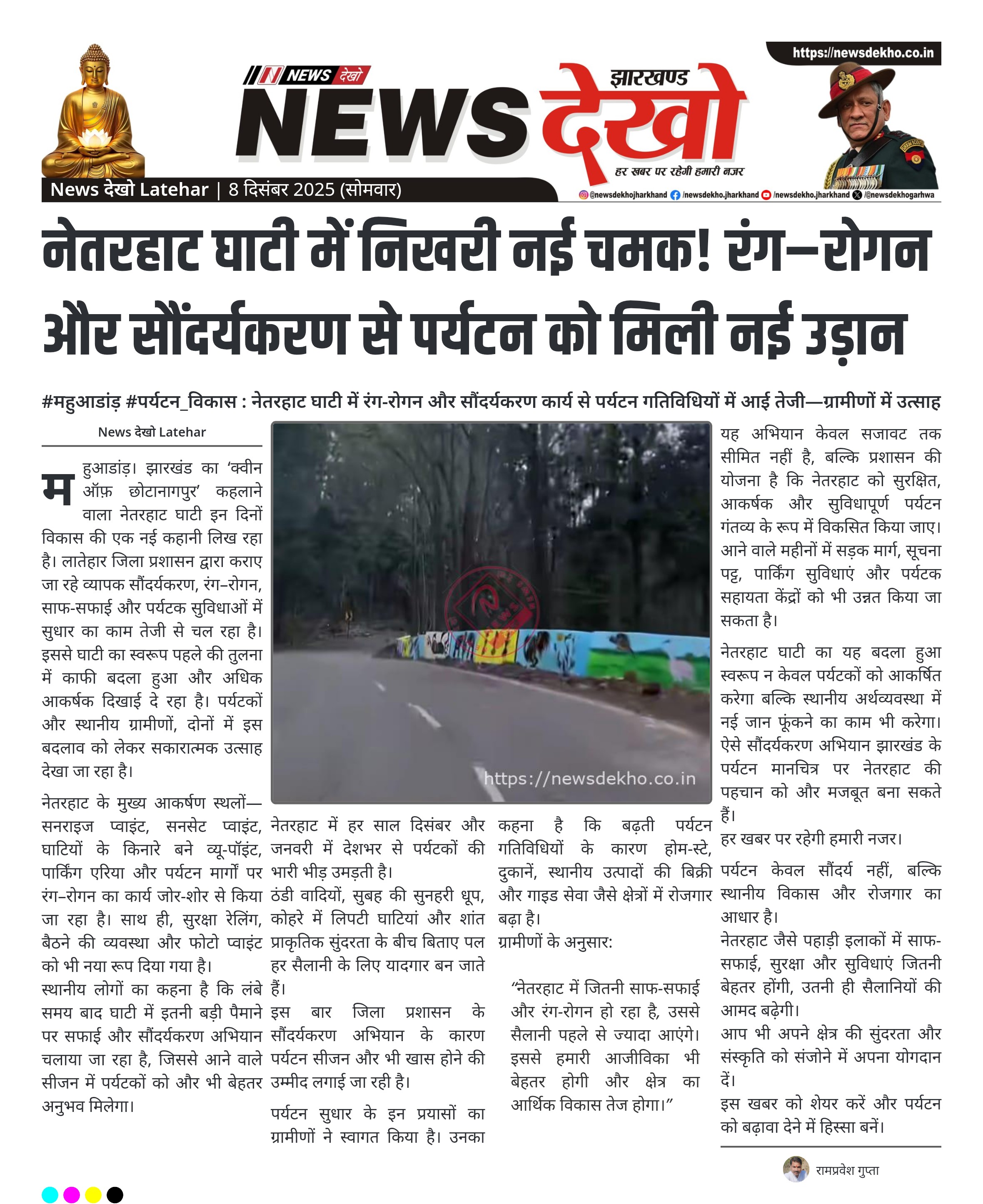 #महुआडांड़ #पर्यटन_विकास : नेतरहाट घाटी में रंग-रोगन और सौंदर्यकरण कार्य से पर्यटन गतिविधियों में आई तेजी—ग्रामीणों में उत्साह नेतरहाट घाटी में जिला प्रशासन द्वारा तेज़ी से सौंदर्यकरण और रंग–रोगन का कार्य। प्रमुख पर्यटन स्थलों पर साफ-सफाई, पेंटिंग और व्यवस्था सुधार से निखर रहा नया स्वरूप। दिसंबर–जनवरी में हजारों सैलानियों की भारी आमद की तैयारी चरम पर। सनराइज–सनसेट प्वाइंट, व्यू-पॉइंट और घाटियों पर हो रही विशेष सजावट। ग्रामीणों का कहना—पर्यटन बढ़ने से आर्थिक विकास को मिलेगी नई दिशा। महुआडांड़। झारखंड का…