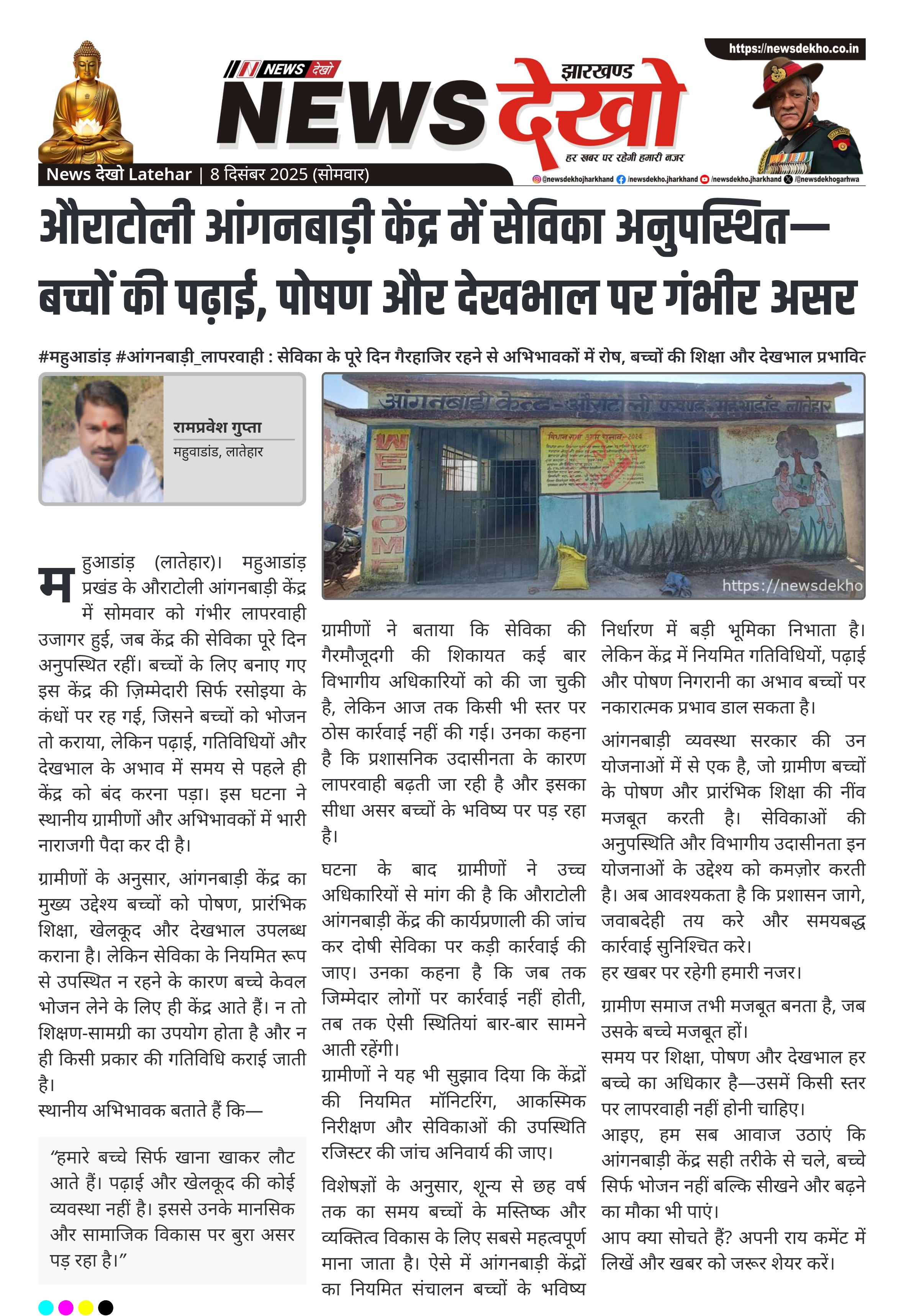 #महुआडांड़ #आंगनबाड़ी_लापरवाही : सेविका के पूरे दिन गैरहाजिर रहने से अभिभावकों में रोष, बच्चों की शिक्षा और देखभाल प्रभावित औराटोली आंगनबाड़ी केंद्र में सोमवार को सेविका पूरे दिन गायब। केंद्र पर केवल रसोइया मौजूद रही, भोजन कराकर केंद्र बंद कर दिया गया। ग्रामीणों ने बताया—बच्चे सिर्फ खाना खाने आते हैं, शिक्षा और गतिविधियां नहीं होतीं। सेविका की अनुपस्थिति की शिकायतें पहले भी की गई थीं। अभिभावकों और ग्रामीणों ने जांच और सख्त कार्रवाई की मांग उठाई। महुआडांड़ (लातेहार)। महुआडांड़ प्रखंड…