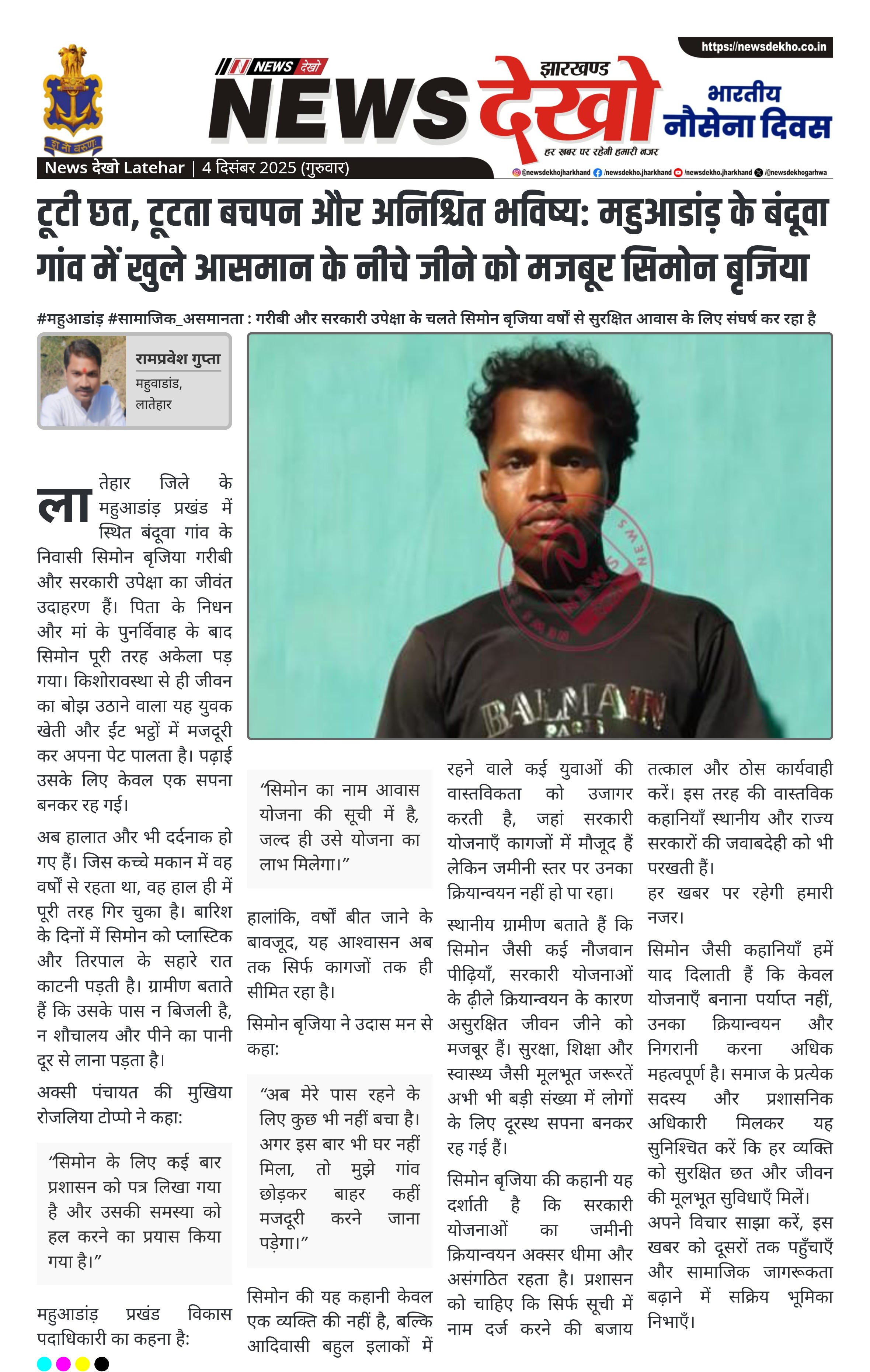 #महुआडांड़ #सामाजिक_असमानता : गरीबी और सरकारी उपेक्षा के चलते सिमोन बृजिया वर्षों से सुरक्षित आवास के लिए संघर्ष कर रहा है सिमोन बृजिया, 25 वर्षीय युवक, महुआडांड़ प्रखंड के बंदूवा गांव में खुले आसमान के नीचे जीवन यापन करने को मजबूर। पिता की मृत्यु के बाद और मां के पुनर्विवाह के कारण सिमोन पूरी तरह अकेला रह गया। वर्तमान में उसका टूटा-फूटा कच्चा मकान गिर चुका है और वह बारिश में प्लास्टिक व तिरपाल के सहारे रात गुजारता है। न…
