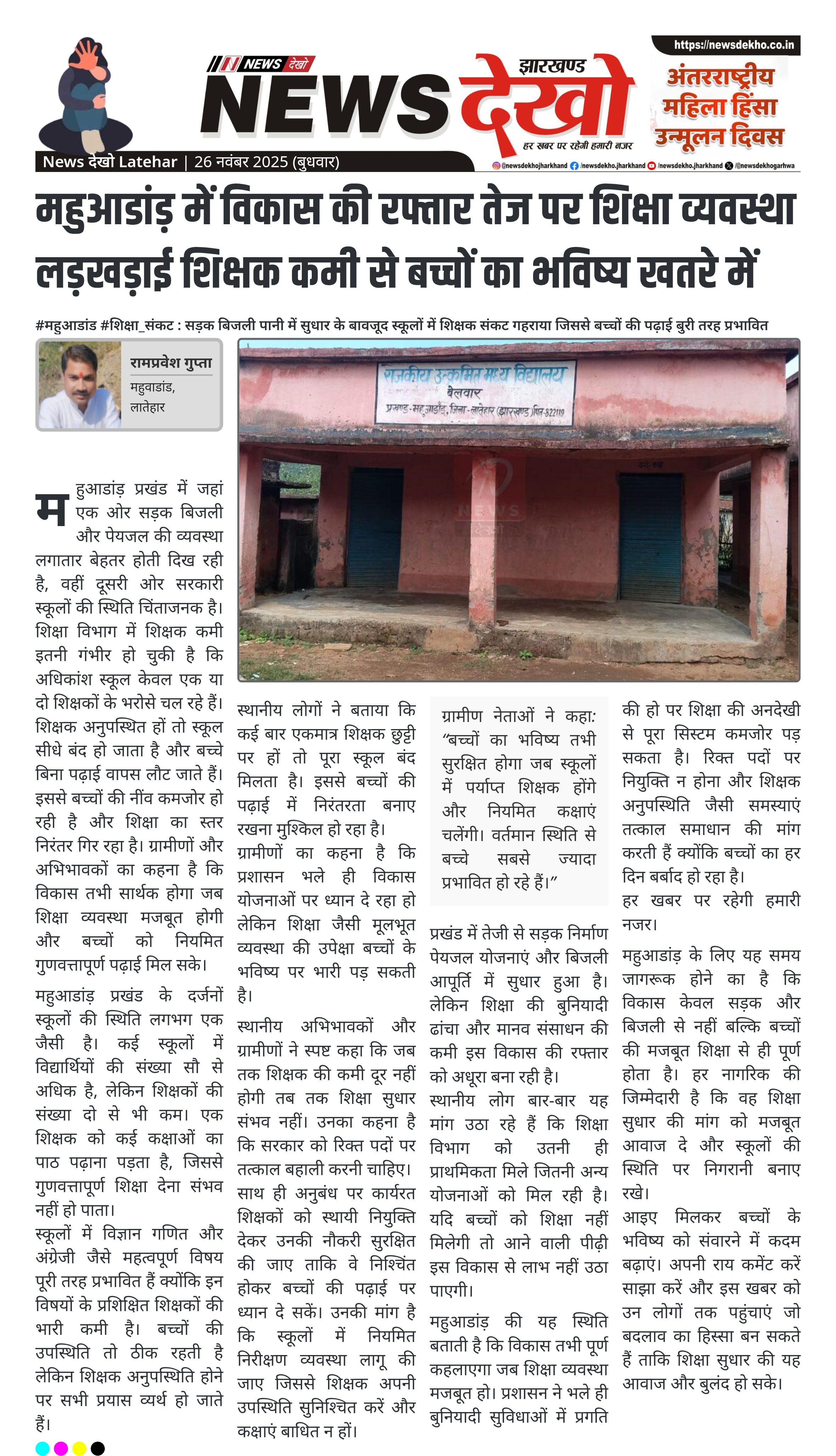 #महुआडांड #शिक्षा_संकट : सड़क बिजली पानी में सुधार के बावजूद स्कूलों में शिक्षक संकट गहराया जिससे बच्चों की पढ़ाई बुरी तरह प्रभावित महुआडांड़ प्रखंड में सड़क बिजली पेयजल जैसी सुविधाओं में तेजी से सुधार। सरकारी स्कूलों में शिक्षकों की भारी कमी शिक्षा व्यवस्था को प्रभावित कर रही है। कई स्कूलों में सिर्फ एक या दो शिक्षक, अनुपस्थित होने पर स्कूल बंद। बच्चों की बुनियादी पढ़ाई प्रभावित भविष्य पर गंभीर असर। ग्रामीणों और अभिभावकों ने रिक्त पदों की जल्द बहाली और…