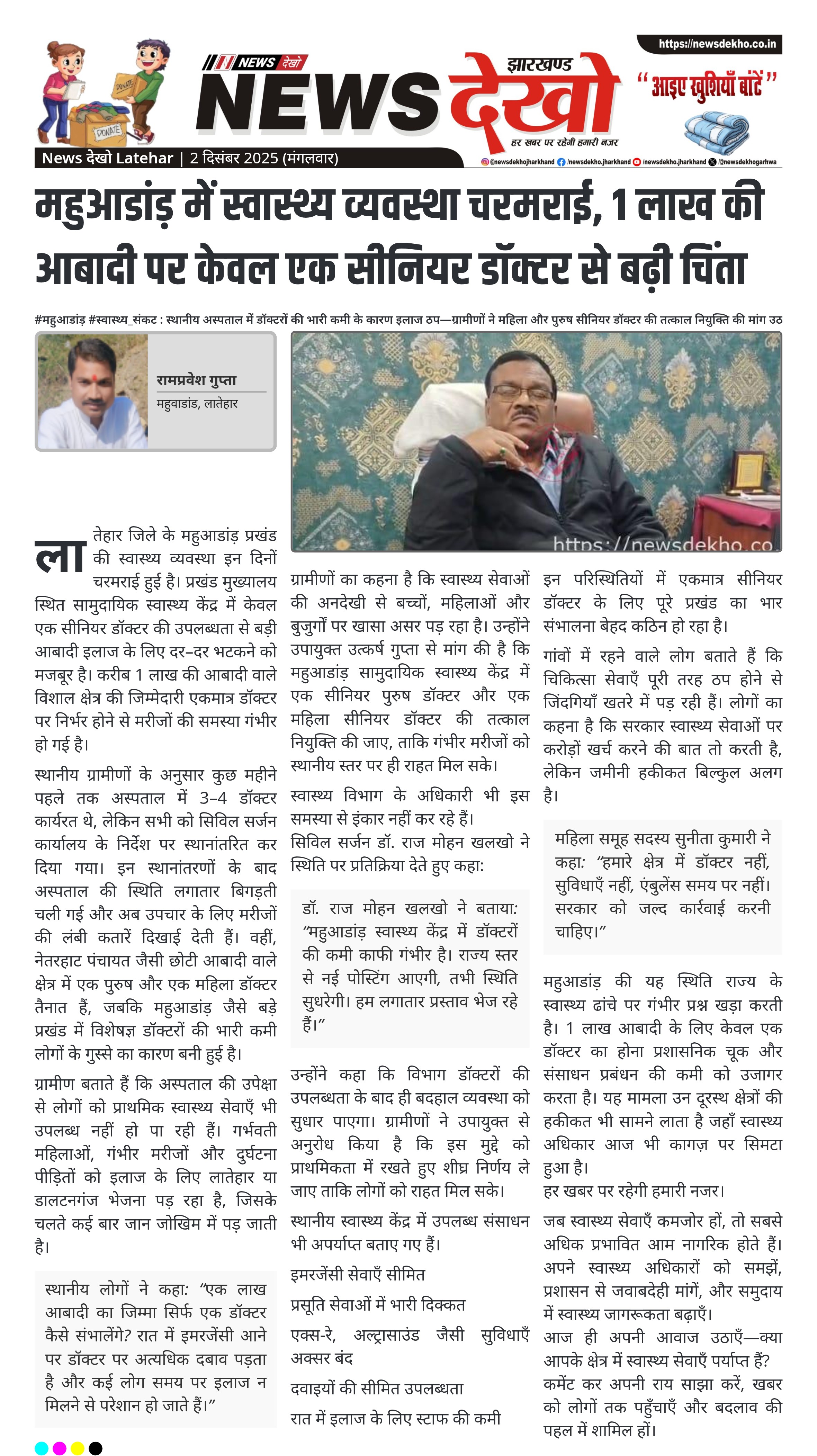 #महुआडांड़ #स्वास्थ्य_संकट : स्थानीय अस्पताल में डॉक्टरों की भारी कमी के कारण इलाज ठप—ग्रामीणों ने महिला और पुरुष सीनियर डॉक्टर की तत्काल नियुक्ति की मांग उठाई महुआडांड़ सामुदायिक स्वास्थ्य केंद्र में केवल एक सीनियर डॉक्टर तैनात। करीब 1 लाख आबादी वाले क्षेत्र में स्वास्थ्य सेवाएँ बुरी तरह प्रभावित। कुछ महीने पहले तक कार्यरत 3–4 डॉक्टरों का सिविल सर्जन कार्यालय द्वारा स्थानांतरण। ग्रामीणों ने उपायुक्त उत्कर्ष गुप्ता से महिला एवं पुरुष दोनों सीनियर डॉक्टर की नियुक्ति की मांग की। सिविल सर्जन…
