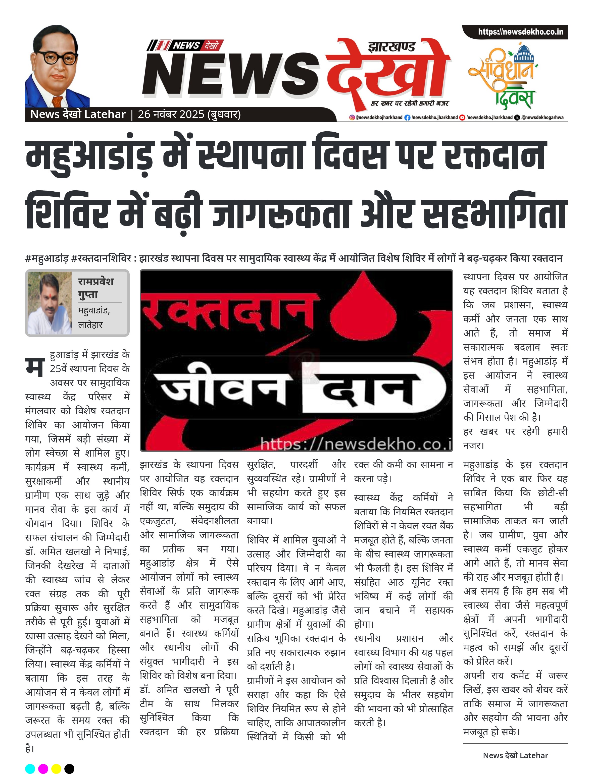 #महुआडांड़ #रक्तदानशिविर : झारखंड स्थापना दिवस पर सामुदायिक स्वास्थ्य केंद्र में आयोजित विशेष शिविर में लोगों ने बढ़-चढ़कर किया रक्तदान महुआडांड़ के सामुदायिक स्वास्थ्य केंद्र में विशेष रक्तदान शिविर आयोजित किया गया। शिविर का नेतृत्व डॉ. अमित खलखो ने किया और पूरी प्रक्रिया उनकी देखरेख में पूरी हुई। स्वास्थ्य कर्मियों, सुरक्षाकर्मियों और ग्रामीणों ने स्वेच्छा से पहुँचकर रक्तदान किया। कुल आठ यूनिट रक्त संग्रह किया गया। युवाओं में रक्तदान को लेकर विशेष उत्साह देखने को मिला। स्वास्थ्य केंद्र कर्मियों के…