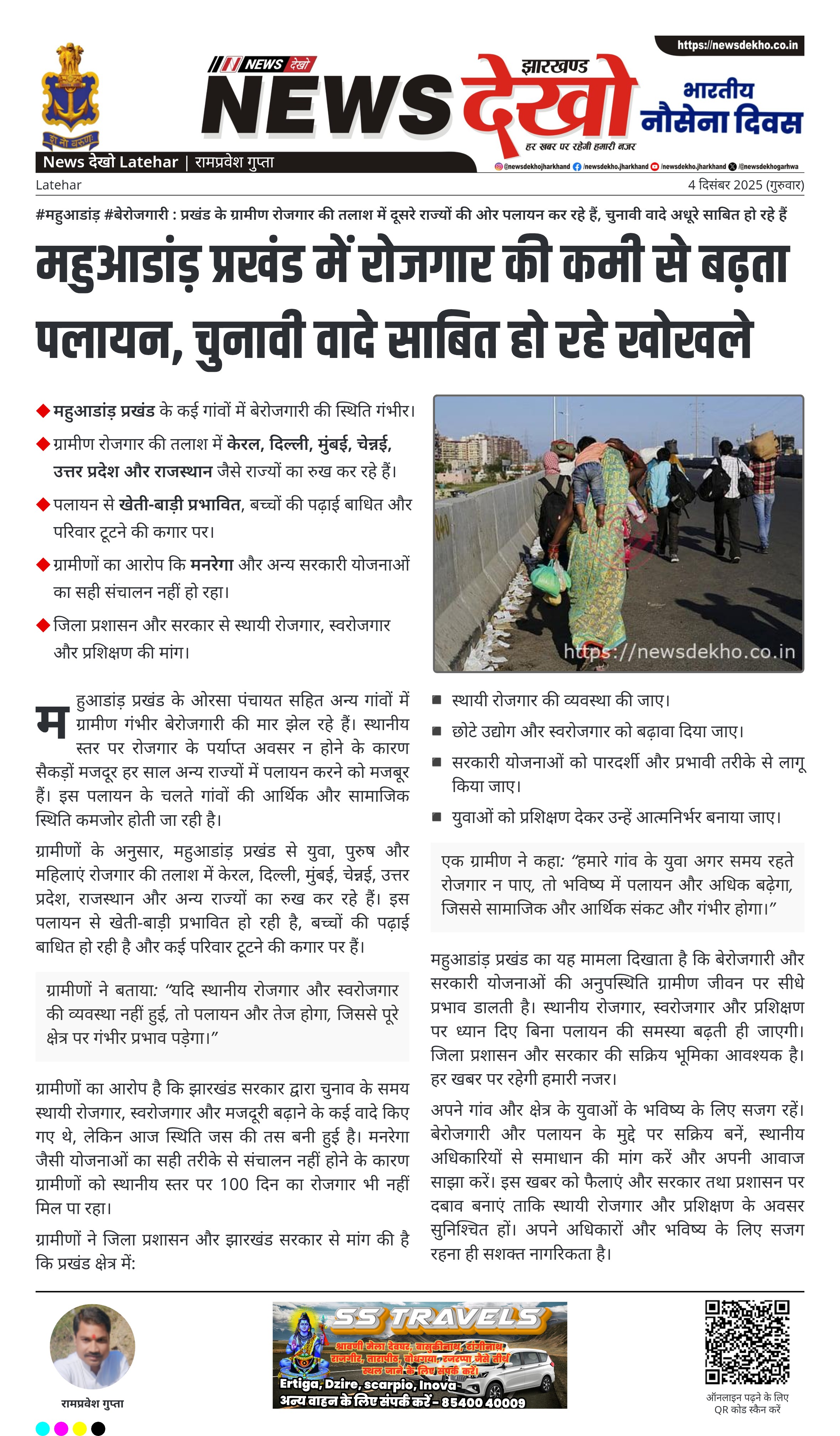 #महुआडांड़ #बेरोजगारी : प्रखंड के ग्रामीण रोजगार की तलाश में दूसरे राज्यों की ओर पलायन कर रहे हैं, चुनावी वादे अधूरे साबित हो रहे हैं महुआडांड़ प्रखंड के कई गांवों में बेरोजगारी की स्थिति गंभीर। ग्रामीण रोजगार की तलाश में केरल, दिल्ली, मुंबई, चेन्नई, उत्तर प्रदेश और राजस्थान जैसे राज्यों का रुख कर रहे हैं। पलायन से खेती-बाड़ी प्रभावित, बच्चों की पढ़ाई बाधित और परिवार टूटने की कगार पर। ग्रामीणों का आरोप कि मनरेगा और अन्य सरकारी योजनाओं का सही…