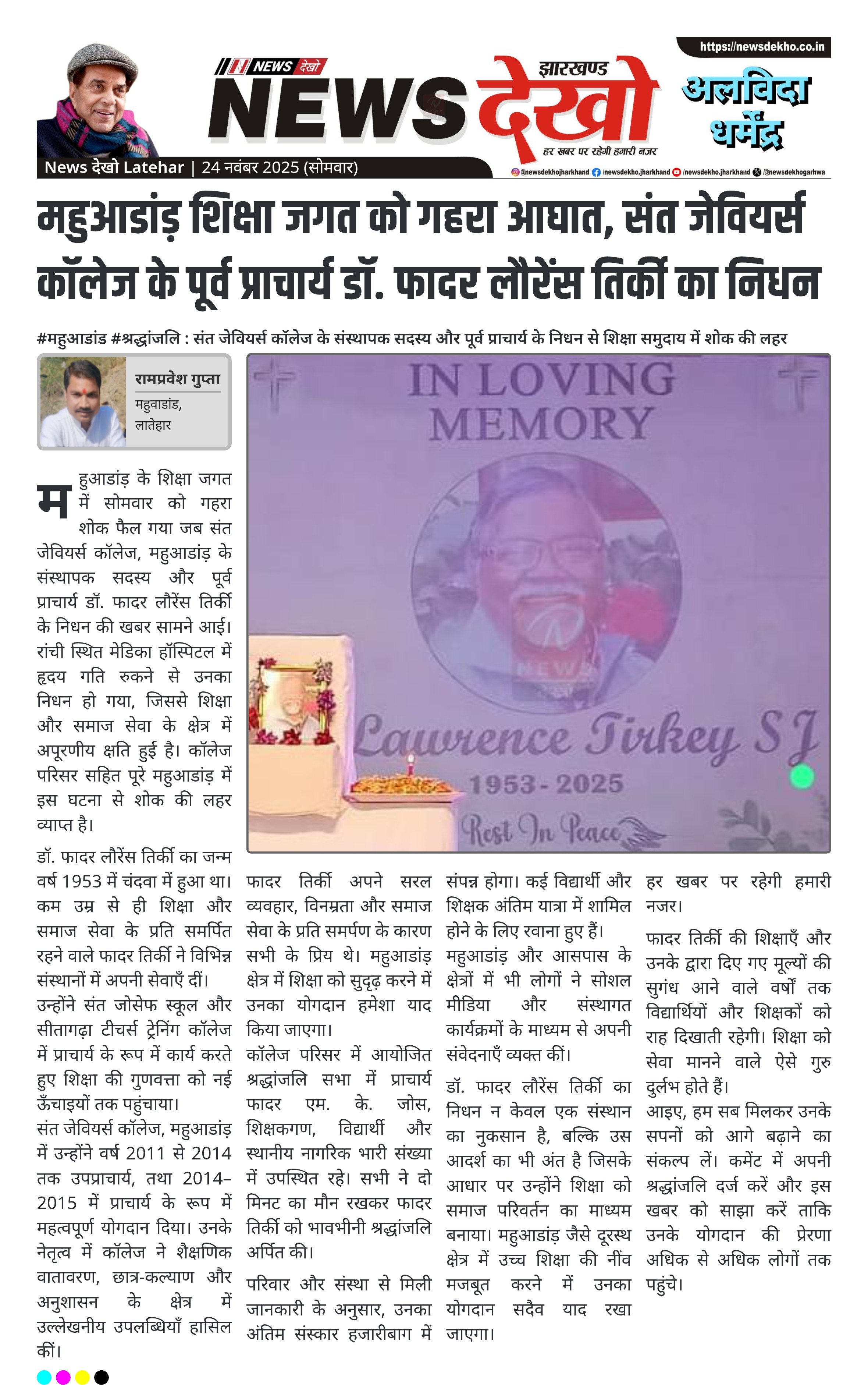 महुआडांड़ शिक्षा जगत को गहरा आघात, संत जेवियर्स कॉलेज के पूर्व प्राचार्य डॉ. फादर लौरेंस तिर्की का निधन