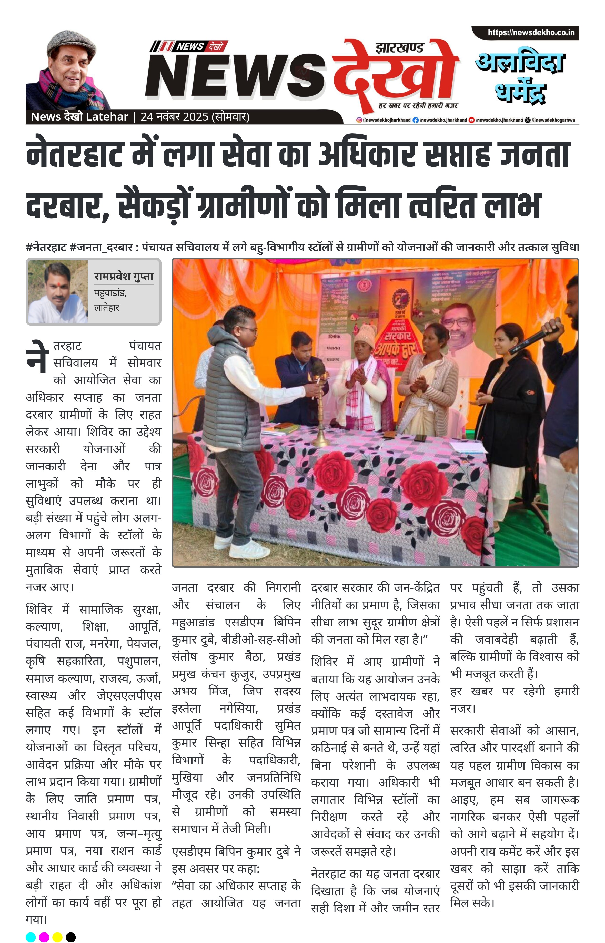 #नेतरहाट #जनता_दरबार : पंचायत सचिवालय में लगे बहु-विभागीय स्टॉलों से ग्रामीणों को योजनाओं की जानकारी और तत्काल सुविधा नेतरहाट पंचायत सचिवालय में सेवा का अधिकार सप्ताह के तहत जनता दरबार आयोजित। विभिन्न विभागों ने सामाजिक सुरक्षा से लेकर स्वास्थ्य तक स्टॉल लगाए। जाति, स्थानीय, आय, जन्म-मृत्यु प्रमाण पत्र और राशन कार्ड–आधार की त्वरित सेवा उपलब्ध। महुआडांड एसडीएम बिपिन कुमार दुबे और बीडीओ संतोष कुमार बैठा रहे उपस्थित। सैकड़ों ग्रामीण मौके पर लाभान्वित हुए। नेतरहाट पंचायत सचिवालय में सोमवार को आयोजित…