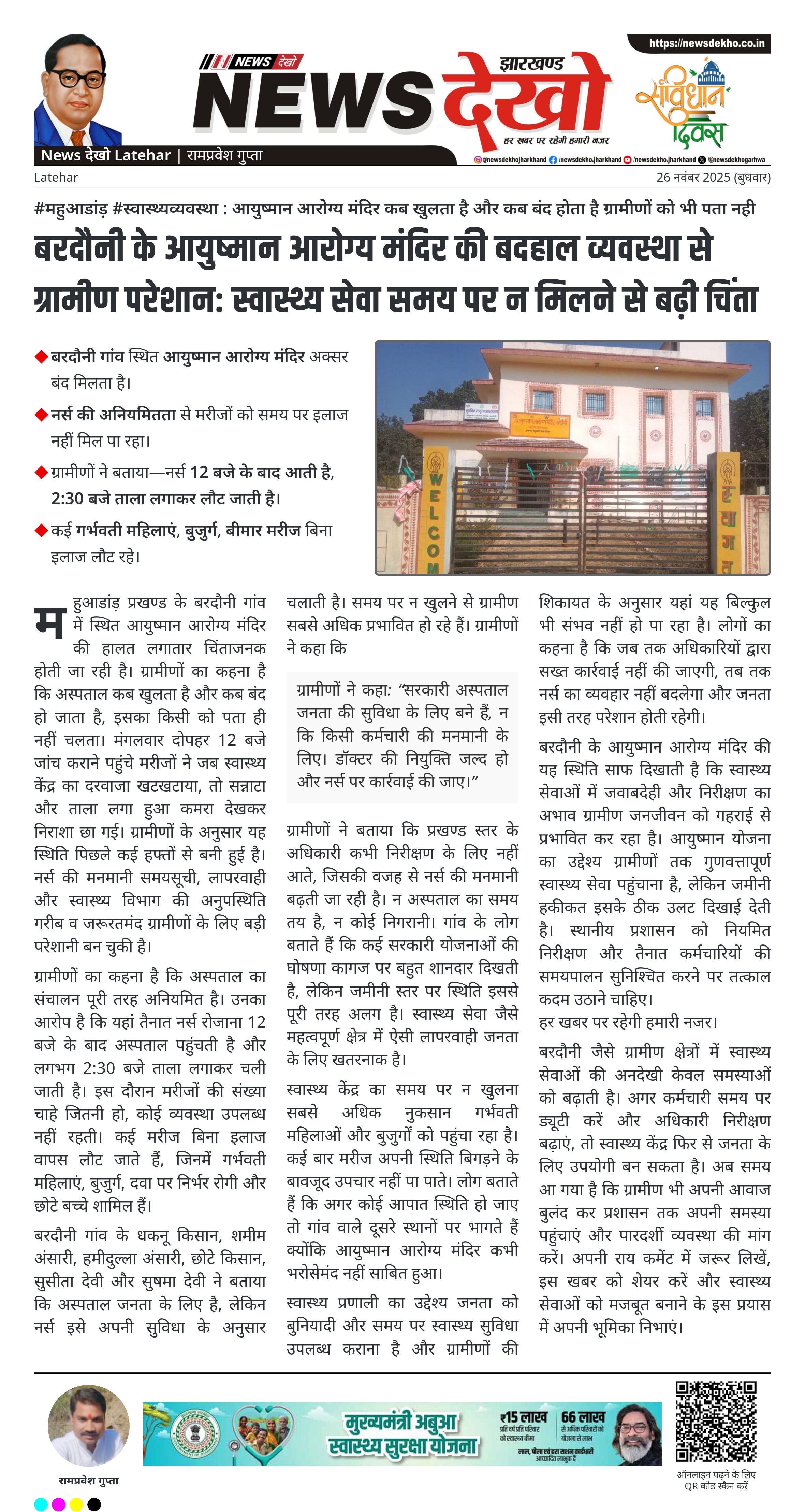 #महुआडांड़ #स्वास्थ्यव्यवस्था : आयुष्मान आरोग्य मंदिर कब खुलता है और कब बंद होता है ग्रामीणों को भी पता नही बरदौनी गांव स्थित आयुष्मान आरोग्य मंदिर अक्सर बंद मिलता है। नर्स की अनियमितता से मरीजों को समय पर इलाज नहीं मिल पा रहा। ग्रामीणों ने बताया—नर्स 12 बजे के बाद आती है, 2:30 बजे ताला लगाकर लौट जाती है। कई गर्भवती महिलाएं, बुजुर्ग, बीमार मरीज बिना इलाज लौट रहे। ग्रामीण धकनू किसान, शमीम अंसारी, हमीदुल्ला अंसारी, छोटे किसान, सुसीता देवी, सुषमा…