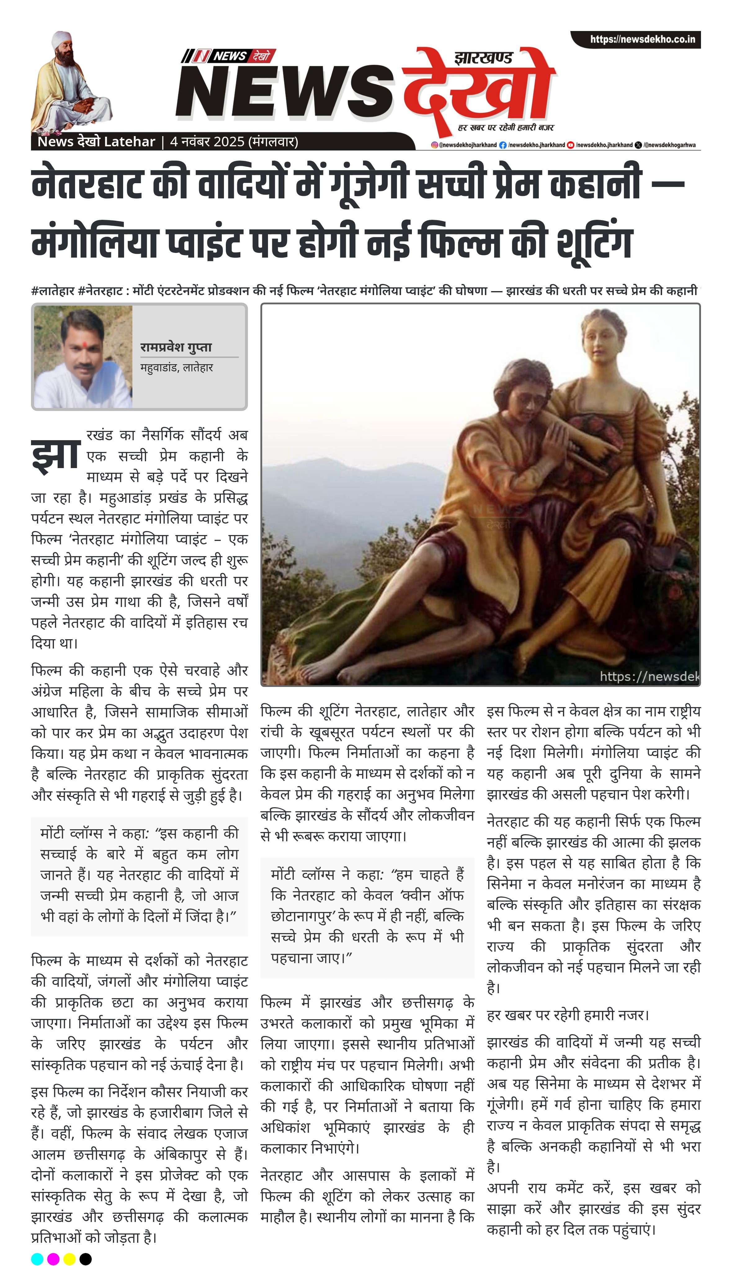 #लातेहार #नेतरहाट : मोंटी एंटरटेनमेंट प्रोडक्शन की नई फिल्म ‘नेतरहाट मंगोलिया प्वाइंट’ की घोषणा — झारखंड की धरती पर सच्चे प्रेम की कहानी होगी जीवंत नेतरहाट मंगोलिया प्वाइंट पर आधारित फिल्म ‘नेतरहाट मंगोलिया प्वाइंट – एक सच्ची प्रेम कहानी’ की शूटिंग जल्द शुरू होगी। फिल्म की कहानी एक चरवाहे और अंग्रेज महिला के सच्चे प्रेम पर आधारित है। फिल्म के निर्देशक कौसर नियाजी और संवाद लेखक एजाज आलम होंगे। फिल्म के लेखक और निर्माता मोंटी व्लॉग्स हैं, जिन्होंने इसकी सच्ची…