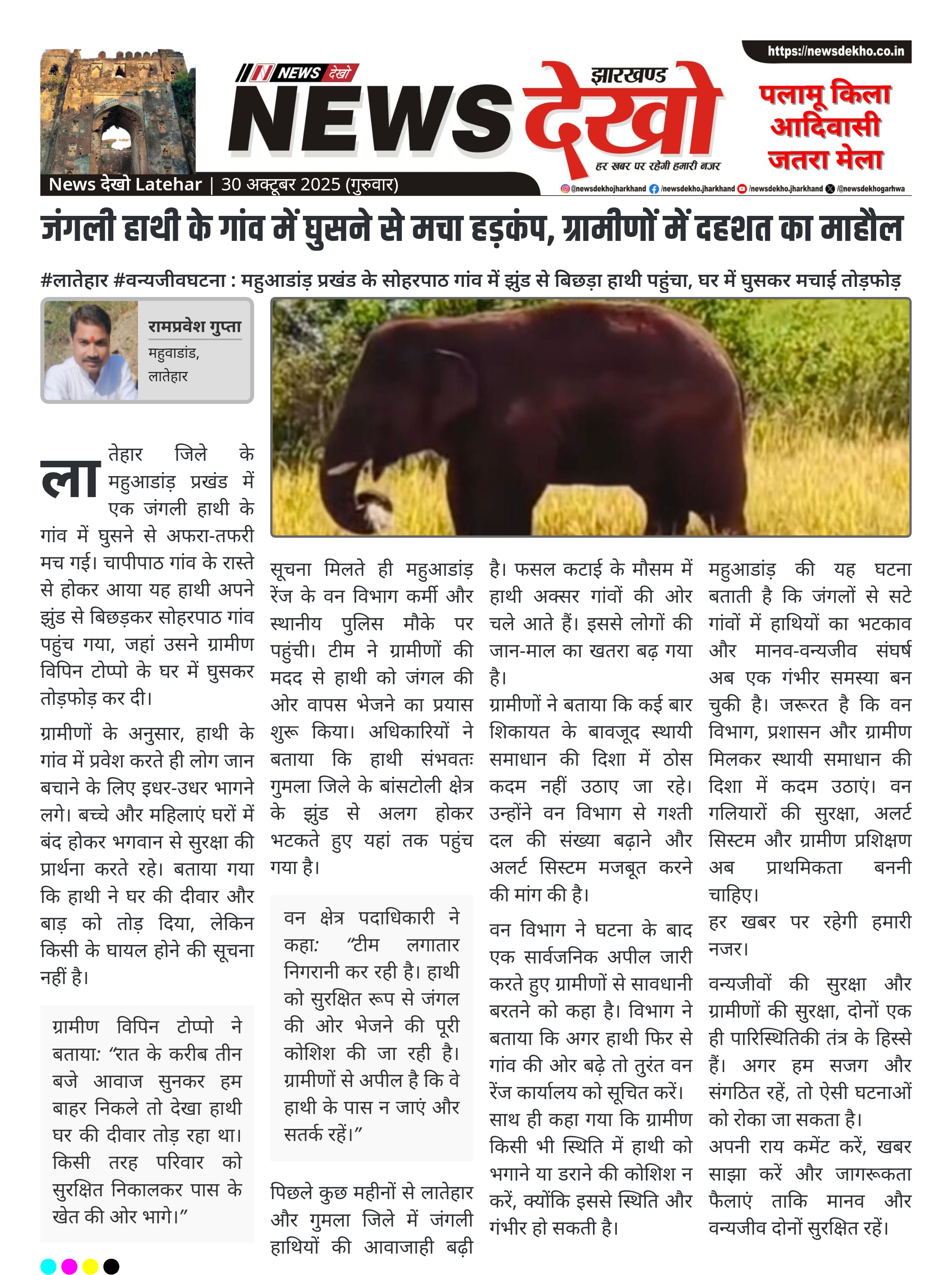 #लातेहार #वन्यजीवघटना : महुआडांड़ प्रखंड के सोहरपाठ गांव में झुंड से बिछड़ा हाथी पहुंचा, घर में घुसकर मचाई तोड़फोड़ महुआडांड़ प्रखंड के चापीपाठ गांव के रास्ते एक जंगली हाथी झुंड से बिछड़कर सोहरपाठ गांव पहुंच गया। हाथी ने ग्रामीण विपिन टोप्पो के घर में घुसकर नुकसान पहुंचाया। घटना से गांव में अफरा-तफरी और दहशत का माहौल बन गया। सूचना पर वन विभाग की टीम मौके पर पहुंची और हाथी को जंगल की ओर भगाने का प्रयास किया जा रहा है।…
