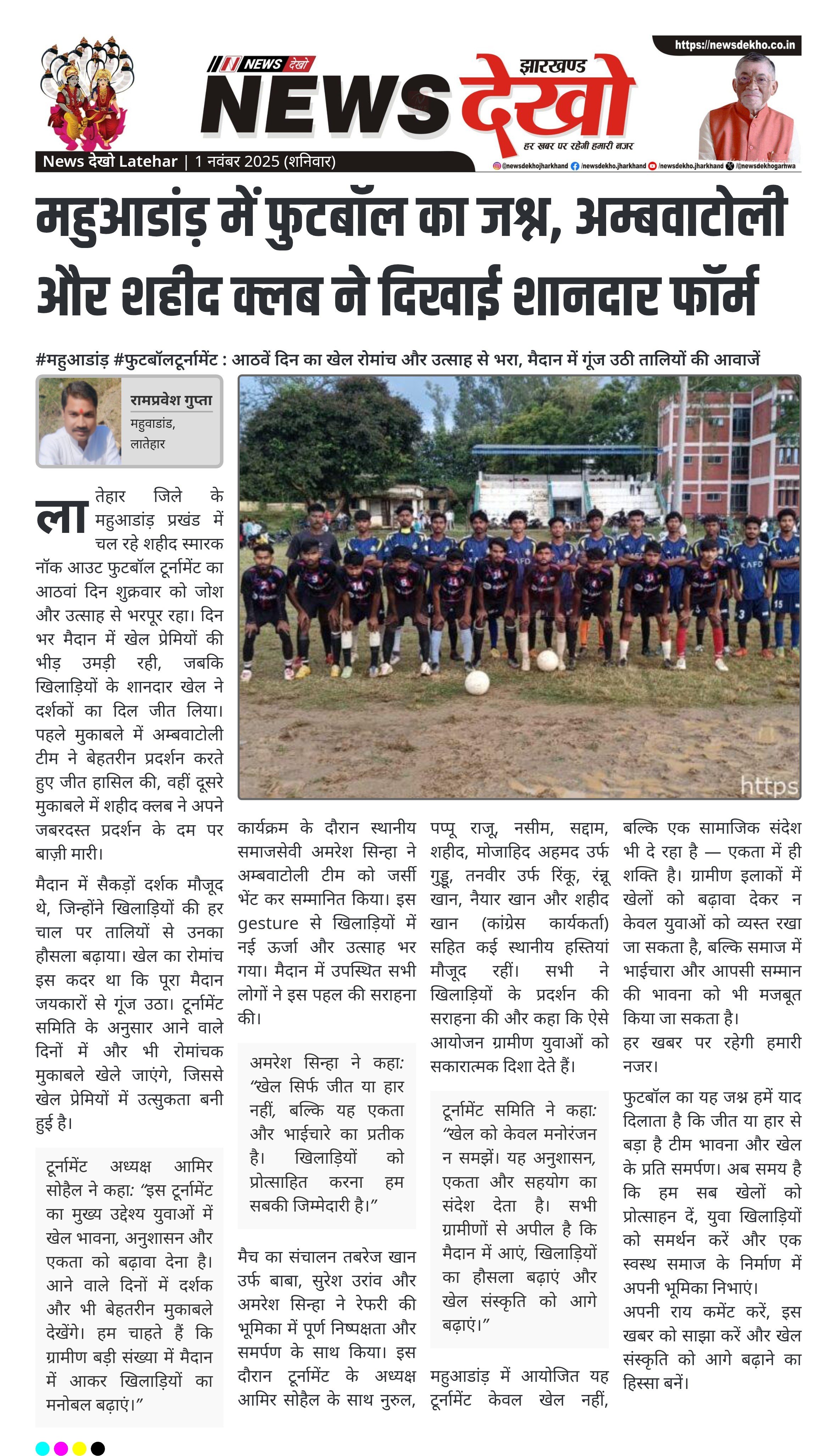 #महुआडांड़ #फुटबॉलटूर्नामेंट : आठवें दिन का खेल रोमांच और उत्साह से भरा, मैदान में गूंज उठी तालियों की आवाजें महुआडांड़ प्रखंड में चल रहे शहीद स्मारक नॉक आउट फुटबॉल टूर्नामेंट का आठवां दिन रहा रोमांचक। अम्बवाटोली टीम और शहीद क्लब ने अपने-अपने मुकाबले में शानदार जीत दर्ज की। मैदान में सैकड़ों दर्शक जुटे, खिलाड़ियों को मिला जबरदस्त समर्थन। अध्यक्ष आमिर सोहैल ने कहा — टूर्नामेंट का उद्देश्य युवाओं में खेल भावना और एकता को बढ़ावा देना है। अमरेश सिन्हा ने…