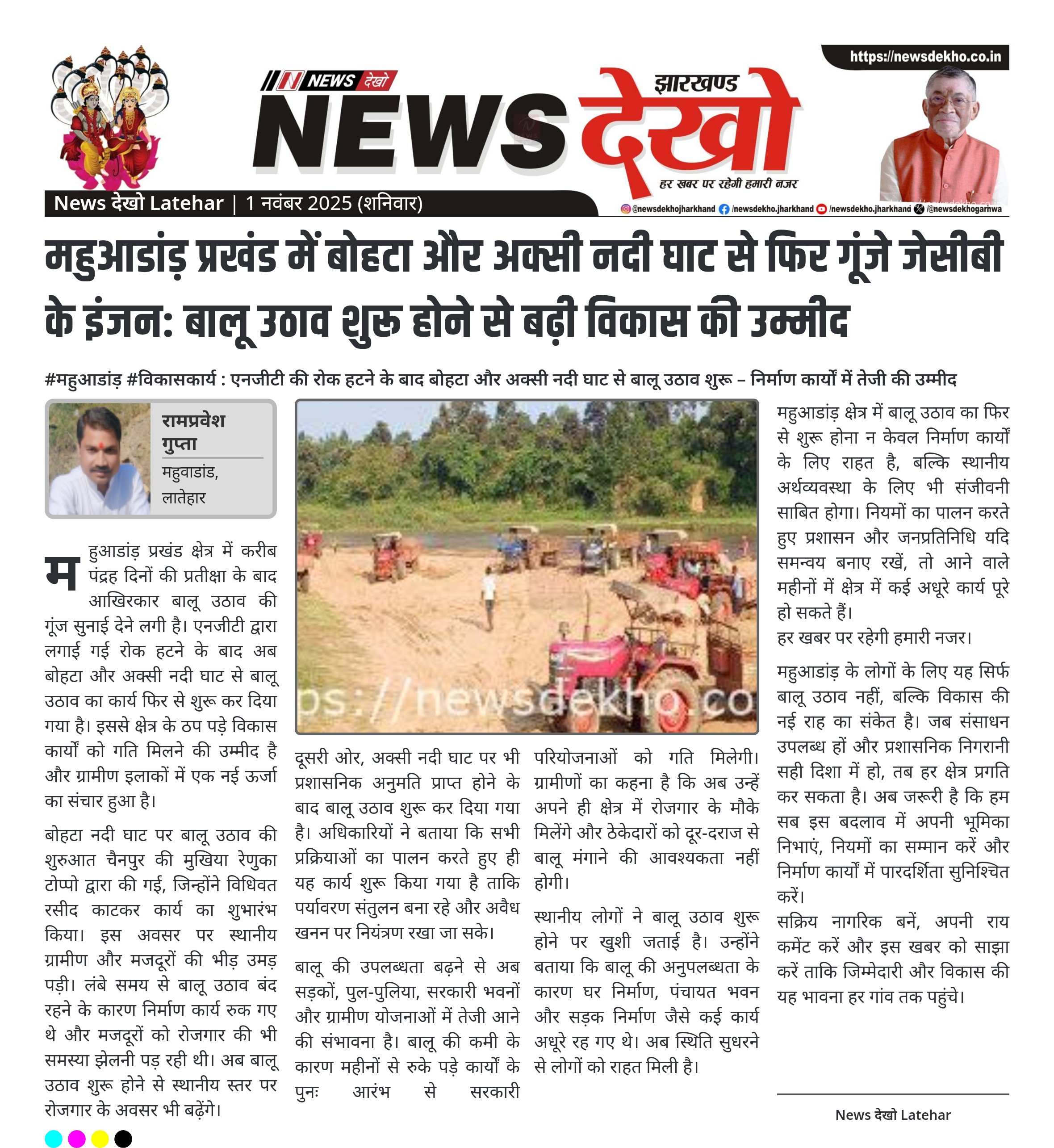 #महुआडांड़ #विकासकार्य : एनजीटी की रोक हटने के बाद बोहटा और अक्सी नदी घाट से बालू उठाव शुरू – निर्माण कार्यों में तेजी की उम्मीद एनजीटी द्वारा लगाई गई रोक हटने के बाद महुआडांड़ प्रखंड क्षेत्र में फिर शुरू हुआ बालू उठाव। बोहटा नदी घाट से मुखिया रेणुका टोप्पो ने रसीद काटकर किया विधिवत उद्घाटन। अक्सी नदी घाट पर भी प्रशासनिक अनुमति के बाद उठाव कार्य आरंभ हुआ। बालू की कमी से ठप पड़े विकास और निर्माण कार्यों में अब…
