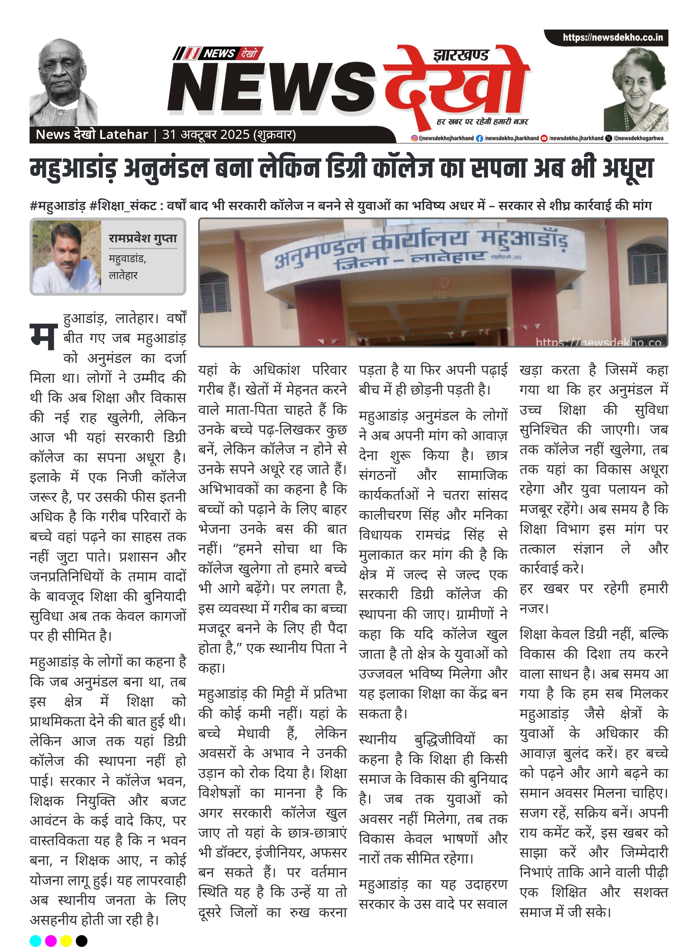 #महुआडांड़ #शिक्षा_संकट : वर्षों बाद भी सरकारी कॉलेज न बनने से युवाओं का भविष्य अधर में – सरकार से शीघ्र कार्रवाई की मांग महुआडांड़ अनुमंडल बने कई वर्ष हो गए, पर सरकारी डिग्री कॉलेज की स्थापना अब तक नहीं हुई। क्षेत्र में केवल निजी कॉलेज है, जिसकी उच्च फीस गरीब परिवारों की पहुंच से बाहर है। सरकारी वादे हर चुनाव में दोहराए जाते हैं, पर अब तक कोई ठोस कदम नहीं उठाया गया। ग्रामीणों और छात्रों में नाराजगी बढ़ी, कहा…