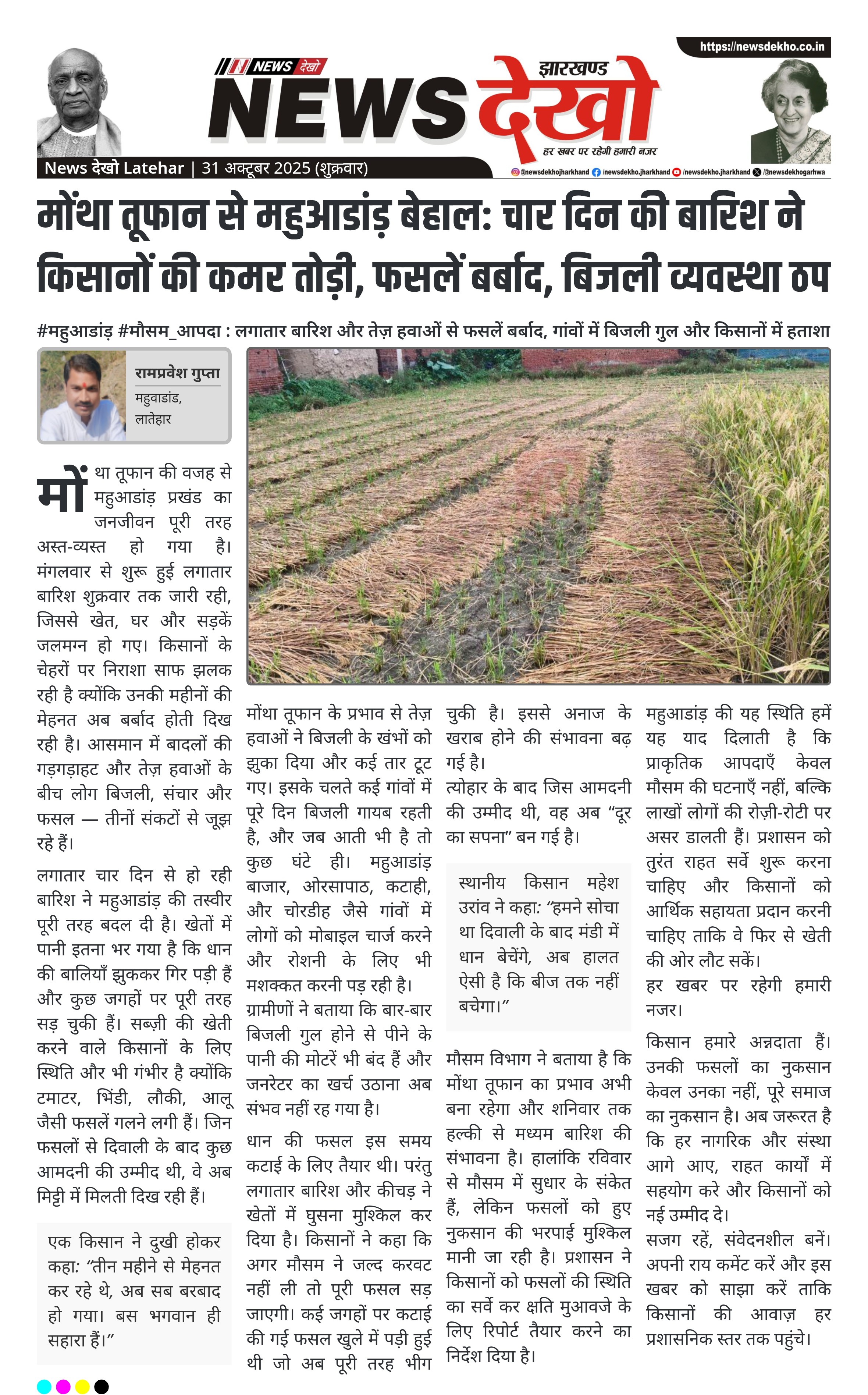 मोंथा तूफान से महुआडांड़ बेहाल: चार दिन की बारिश ने किसानों की कमर तोड़ी, फसलें बर्बाद, बिजली व्यवस्था ठप