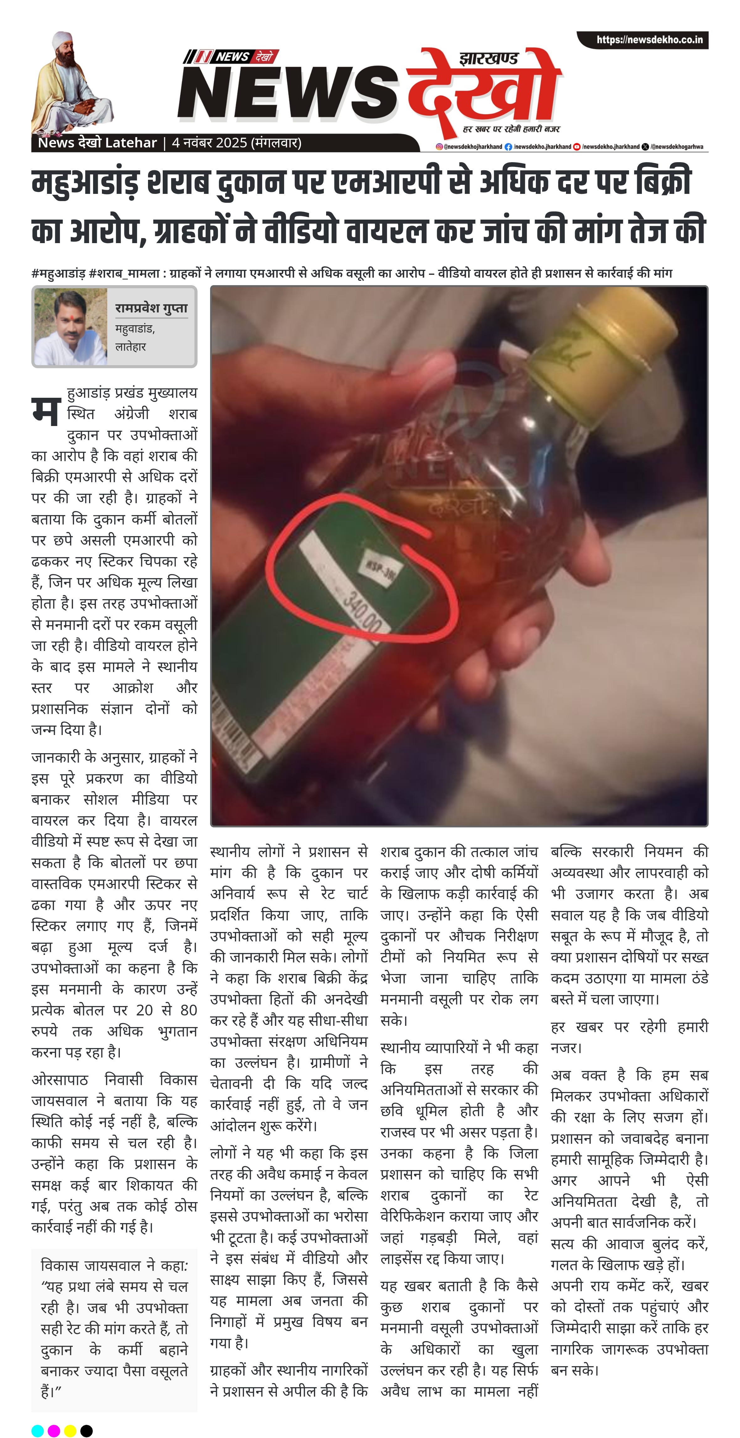 #महुआडांड़ #शराब_मामला : ग्राहकों ने लगाया एमआरपी से अधिक वसूली का आरोप – वीडियो वायरल होते ही प्रशासन से कार्रवाई की मांग महुआडांड़ प्रखंड मुख्यालय की अंग्रेजी शराब दुकान पर एमआरपी से अधिक दर पर बिक्री का आरोप। ग्राहकों ने बोतलों पर छपे असली मूल्य को ढककर नए स्टिकर चिपकाने की बात कही। 20 से 80 रुपये तक अधिक वसूली का आरोप, वीडियो सोशल मीडिया पर हुआ वायरल। विकास जायसवाल ने कहा – “यह प्रथा लंबे समय से चल रही…