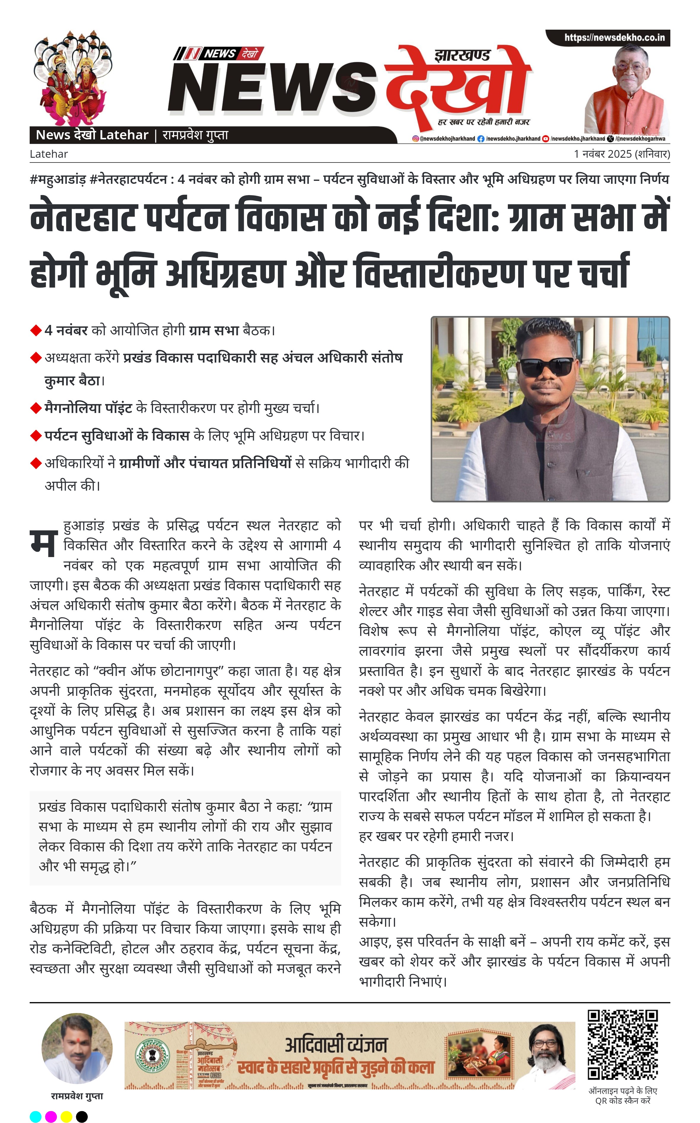 #महुआडांड़ #नेतरहाटपर्यटन : 4 नवंबर को होगी ग्राम सभा – पर्यटन सुविधाओं के विस्तार और भूमि अधिग्रहण पर लिया जाएगा निर्णय 4 नवंबर को आयोजित होगी ग्राम सभा बैठक। अध्यक्षता करेंगे प्रखंड विकास पदाधिकारी सह अंचल अधिकारी संतोष कुमार बैठा। मैगनोलिया पॉइंट के विस्तारीकरण पर होगी मुख्य चर्चा। पर्यटन सुविधाओं के विकास के लिए भूमि अधिग्रहण पर विचार। अधिकारियों ने ग्रामीणों और पंचायत प्रतिनिधियों से सक्रिय भागीदारी की अपील की। महुआडांड़ प्रखंड के प्रसिद्ध पर्यटन स्थल नेतरहाट को विकसित और…