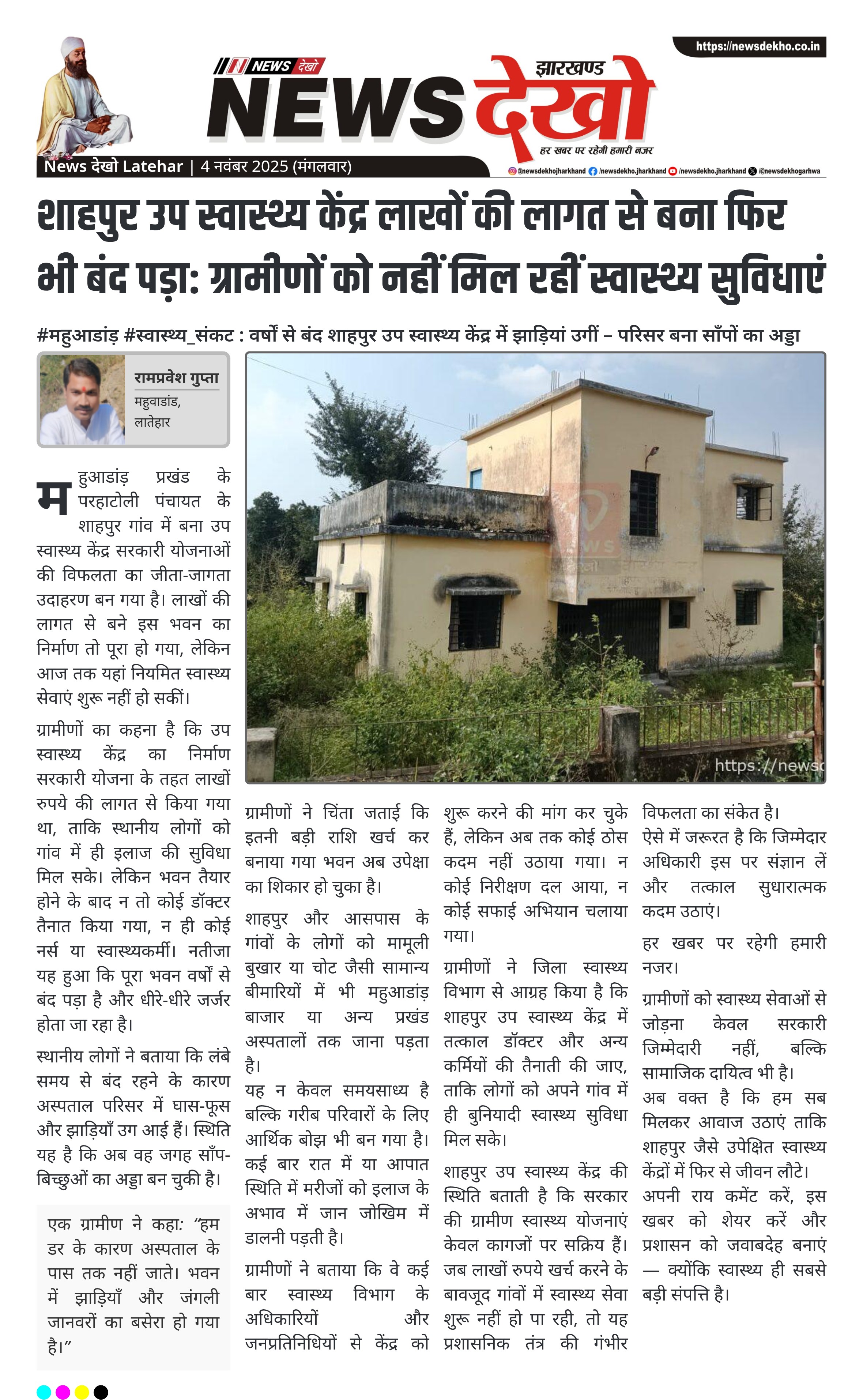 #महुआडांड़ #स्वास्थ्य_संकट : वर्षों से बंद शाहपुर उप स्वास्थ्य केंद्र में झाड़ियां उगीं – परिसर बना साँपों का अड्डा शाहपुर उप स्वास्थ्य केंद्र लाखों की लागत से बना, लेकिन आज तक सेवाएं शुरू नहीं हुईं। डॉक्टर और स्वास्थ्यकर्मी की तैनाती नहीं होने से भवन बेकार पड़ा है। अस्पताल परिसर में घास-फूस और झाड़ियाँ, बना साँप-बिच्छू का अड्डा। ग्रामीणों को प्राथमिक इलाज के लिए महुआडांड़ बाजार जाना पड़ता है। कई बार शिकायत के बावजूद स्वास्थ्य विभाग ने कार्रवाई नहीं की। महुआडांड़…