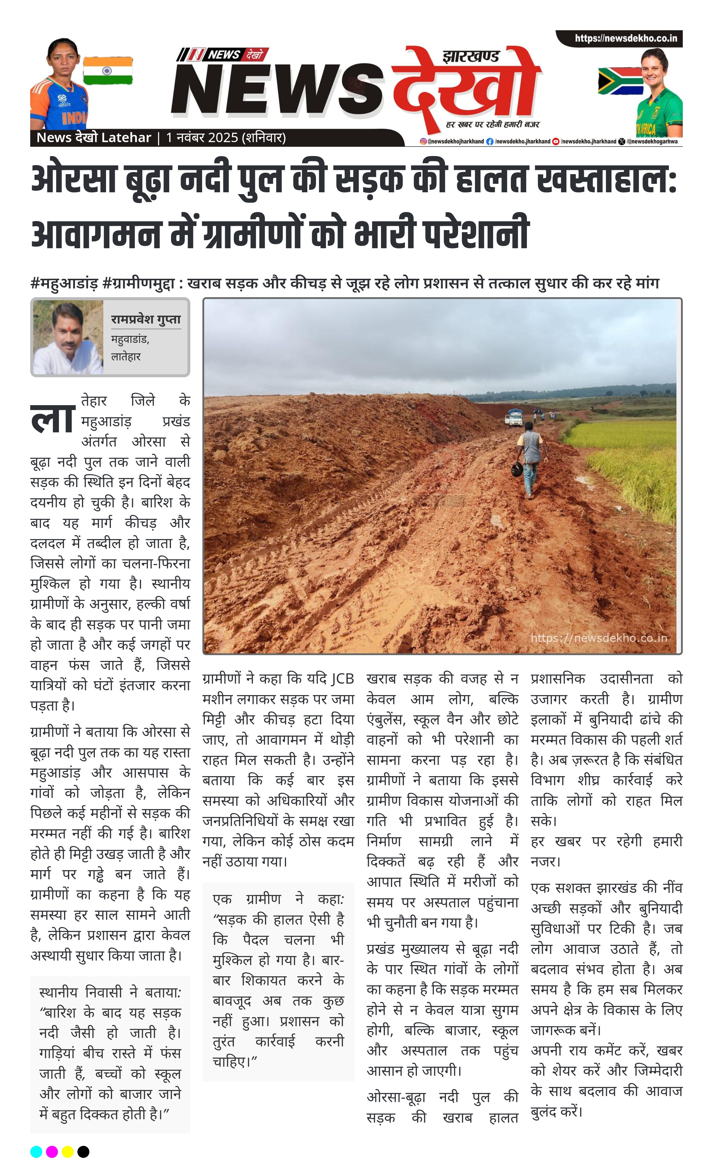 #महुआडांड़ #ग्रामीणमुद्दा : खराब सड़क और कीचड़ से जूझ रहे लोग प्रशासन से तत्काल सुधार की कर रहे मांग महुआडांड़ प्रखंड के ओरसा-बूढ़ा नदी पुल की सड़क पूरी तरह खस्ताहाल हो चुकी है। हल्की बारिश के बाद सड़क पर कीचड़ और पानी भर जाता है, जिससे यातायात ठप हो जाता है। ग्रामीणों ने कई बार अधिकारियों के समक्ष शिकायत दर्ज की, पर सुधार नहीं हुआ। वाहन चालक और पैदल यात्री दोनों को आवागमन में हो रही है भारी मुश्किल। लोगों…