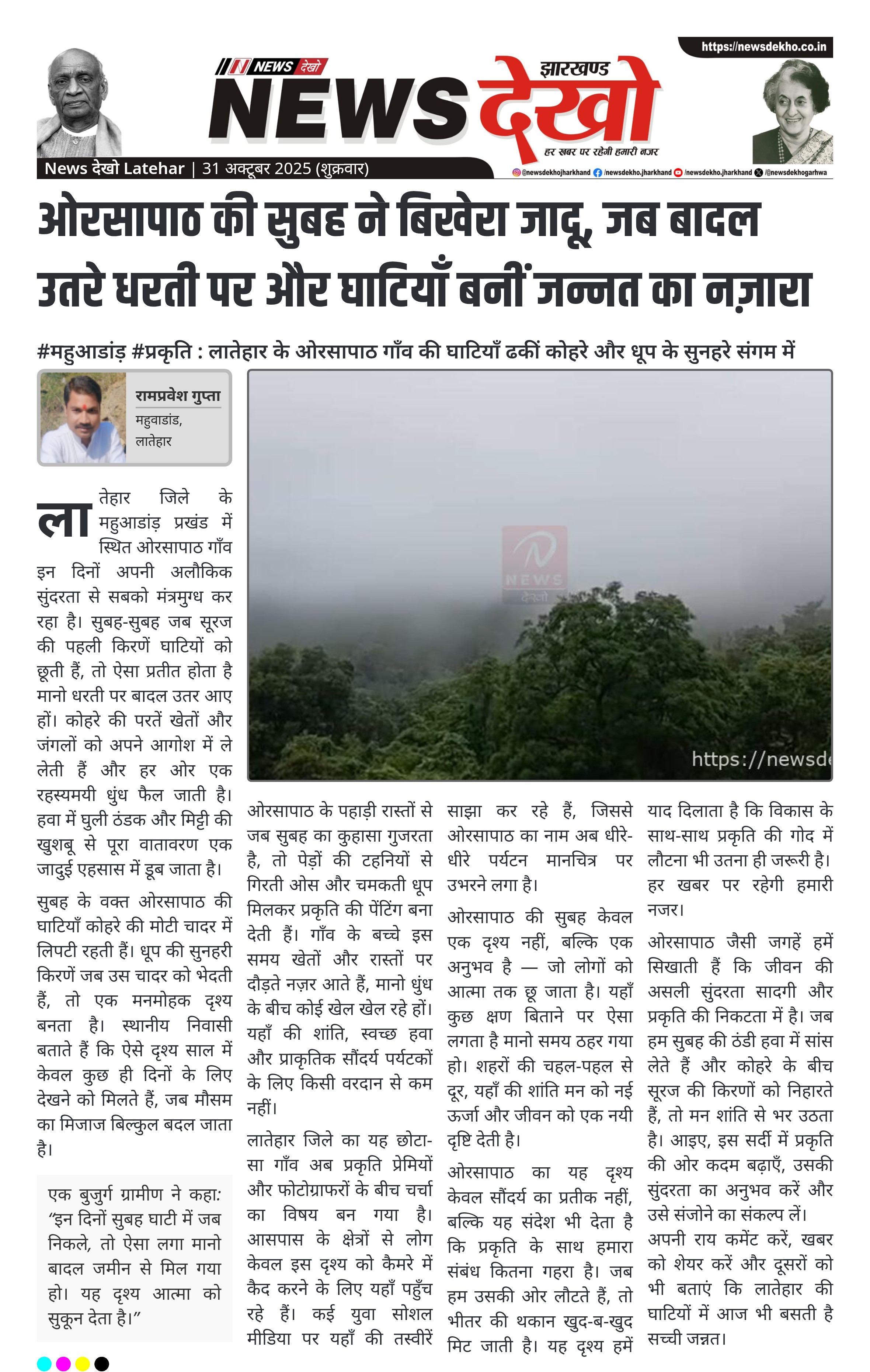 #महुआडांड़ #प्रकृति : लातेहार के ओरसापाठ गाँव की घाटियाँ ढकीं कोहरे और धूप के सुनहरे संगम में महुआडांड़ प्रखंड के ओरसापाठ गाँव में इन दिनों सुबह का नज़ारा स्वर्ग जैसा प्रतीत होता है। बादल इतने नीचे उतर आते हैं कि खेत, पेड़ और पहाड़ों की चोटियाँ सफेद कोहरे में खो जाती हैं। स्थानीय लोगों ने कहा — “ऐसा दृश्य बरसों में एक-दो बार ही देखने को मिलता है।” ठंडी हवा, हल्की धूप और मिट्टी की खुशबू ने मिलकर रचा प्रकृति…