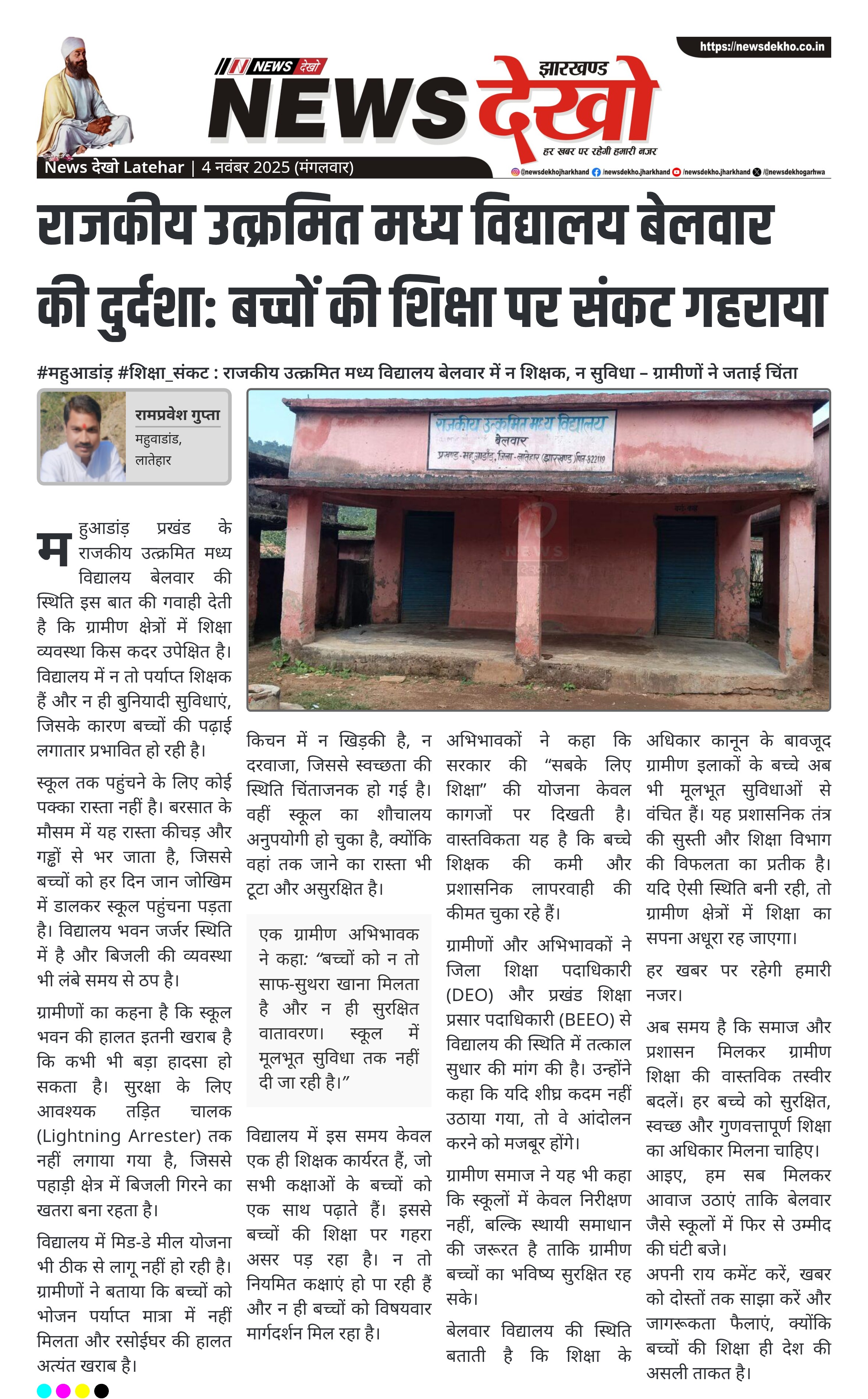 #महुआडांड़ #शिक्षा_संकट : राजकीय उत्क्रमित मध्य विद्यालय बेलवार में न शिक्षक, न सुविधा – ग्रामीणों ने जताई चिंता राजकीय उत्क्रमित मध्य विद्यालय बेलवार की हालत बदहाल, स्कूल में सिर्फ एक शिक्षक कार्यरत। भवन जर्जर, बिजली व्यवस्था ठप, और तड़ित चालक जैसी सुरक्षा सुविधाएं तक नहीं। बरसात में कीचड़ और गड्ढों से गुजरकर स्कूल पहुंचते हैं बच्चे। मिड-डे मील में अनियमितता और स्वच्छता की कमी से बढ़ी दिक्कतें। ग्रामीणों और अभिभावकों ने डीईओ और बीईईओ से तत्काल सुधार की मांग की।…
