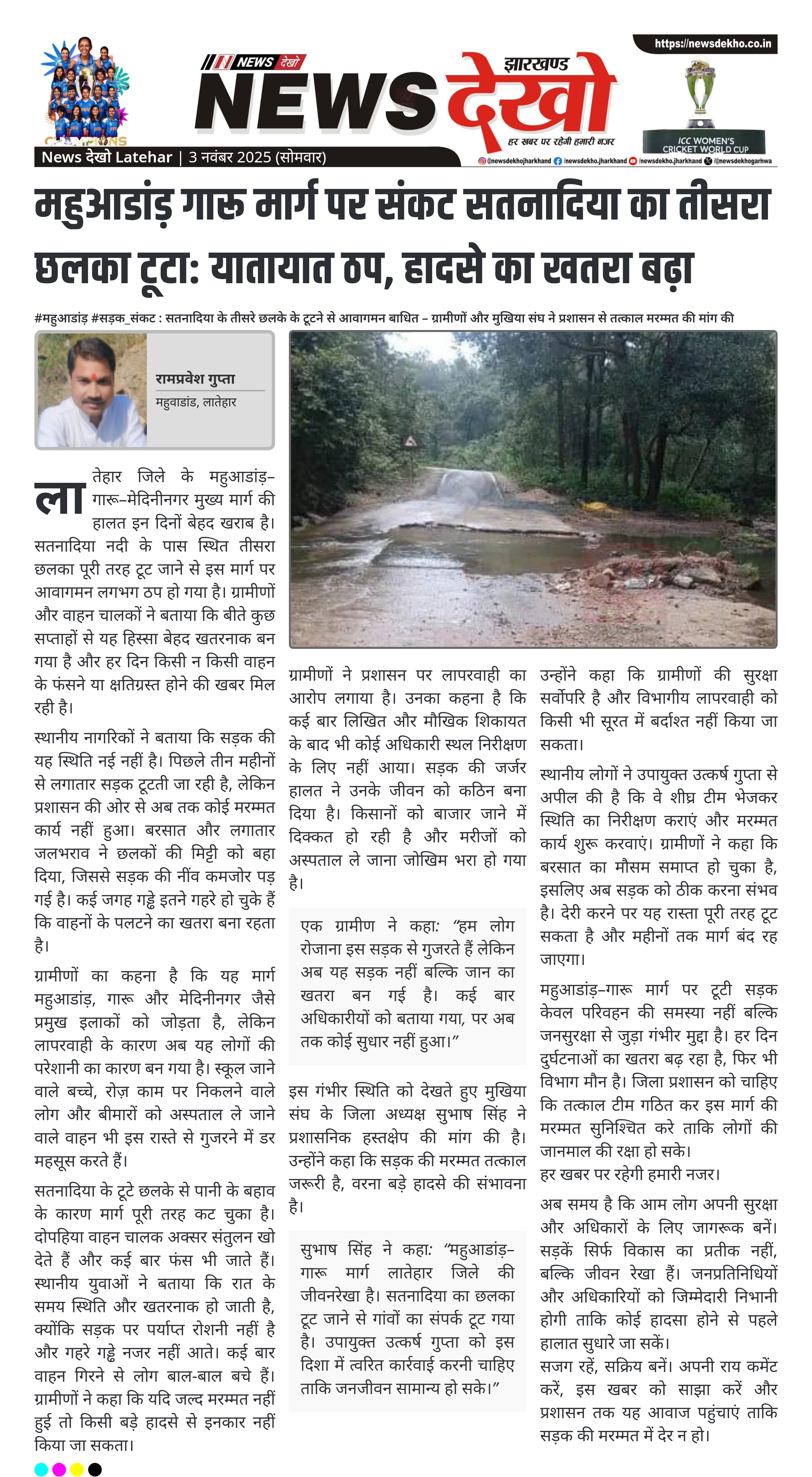 #महुआडांड़ #सड़क_संकट : सतनादिया के तीसरे छलके के टूटने से आवागमन बाधित – ग्रामीणों और मुखिया संघ ने प्रशासन से तत्काल मरम्मत की मांग की महुआडांड़–गारू मार्ग पर सतनादिया का तीसरा छलका पूरी तरह टूट गया है। वाहन फंसने और पलटने की घटनाएं लगातार बढ़ रही हैं। सड़क पिछले तीन महीनों से जर्जर, बरसात ने हालत और बिगाड़ी। मुखिया संघ के जिला अध्यक्ष सुभाष सिंह ने उपायुक्त उत्कर्ष गुप्ता से त्वरित कार्रवाई की मांग की। स्कूल जाने वाले बच्चों, कामकाजी…