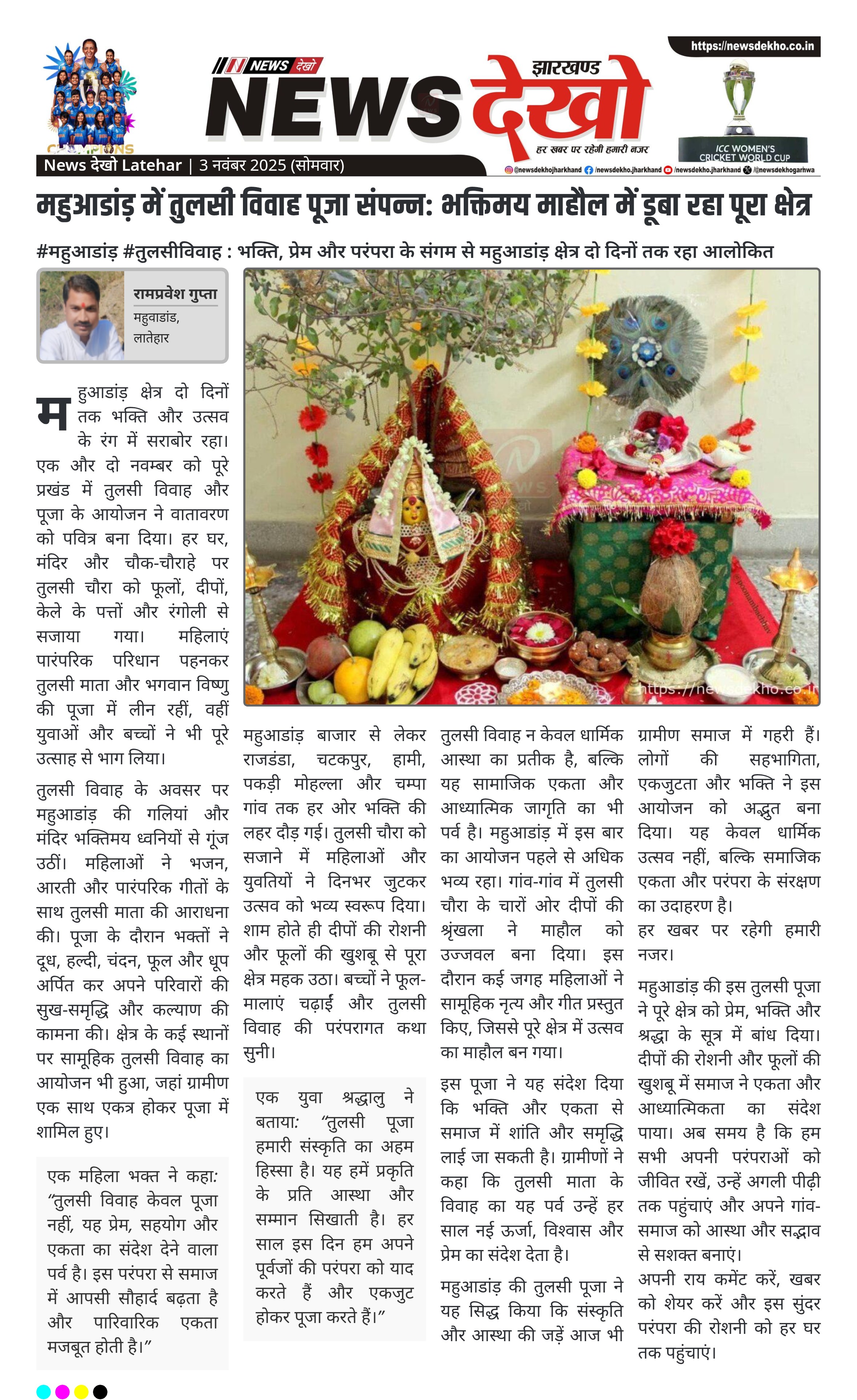 #महुआडांड़ #तुलसीविवाह : भक्ति, प्रेम और परंपरा के संगम से महुआडांड़ क्षेत्र दो दिनों तक रहा आलोकित महुआडांड़ प्रखंड में एक और दो नवम्बर को बड़े हर्षोल्लास और श्रद्धा के साथ तुलसी पूजा संपन्न हुई। महिलाओं और युवाओं ने घरों और मंदिरों में तुलसी चौरा को फूलों, दीपों और रंगोली से सजाया। भगवान विष्णु और तुलसी माता की आराधना कर परिवार की सुख-समृद्धि की कामना की गई। गांव-गांव में हुआ तुलसी विवाह, महिलाओं ने गाए भक्ति गीत और किया सामूहिक…