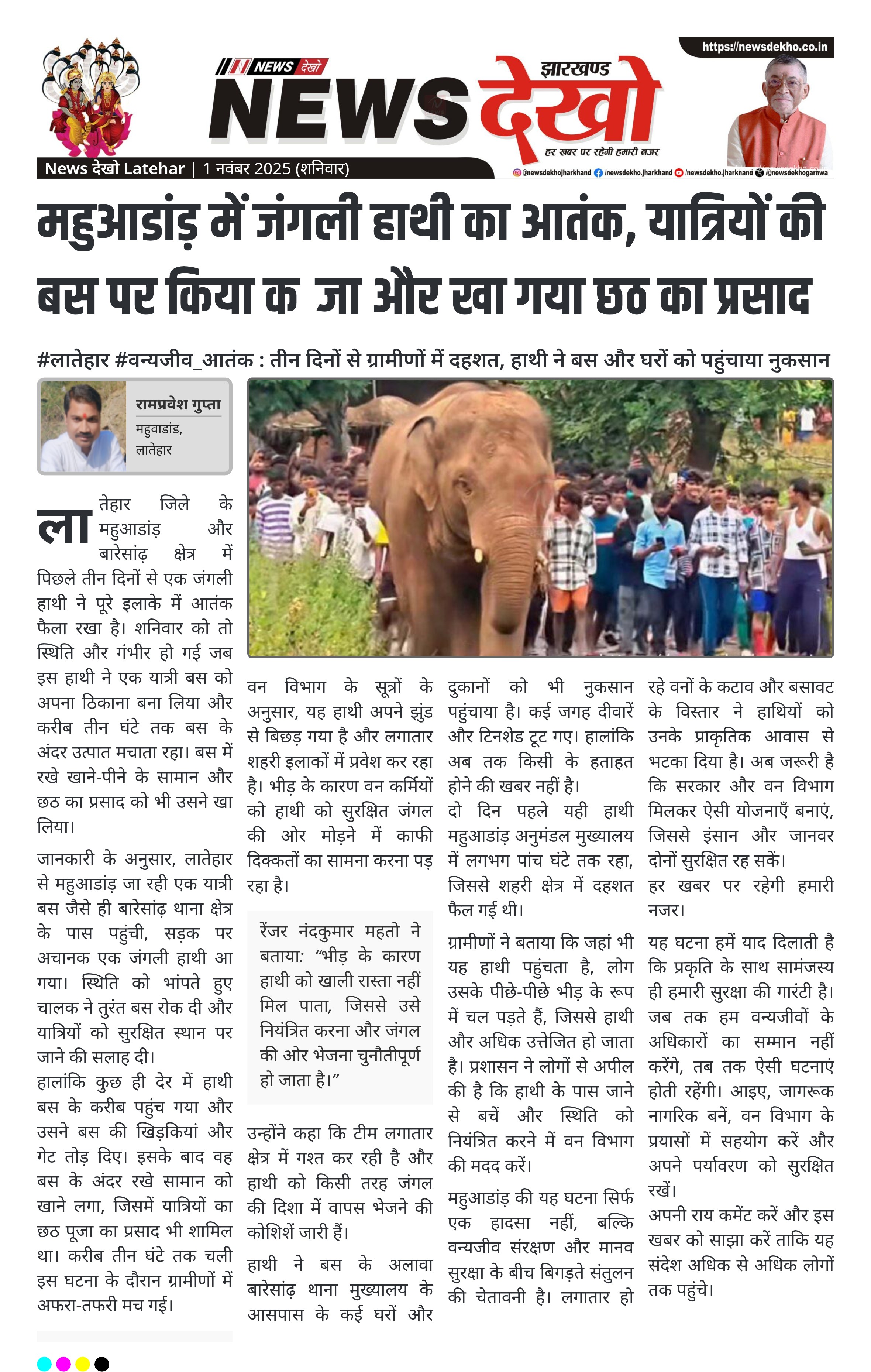 #लातेहार #वन्यजीव_आतंक : तीन दिनों से ग्रामीणों में दहशत, हाथी ने बस और घरों को पहुंचाया नुकसान महुआडांड़ और बारेसांढ़ थाना क्षेत्र में तीन दिनों से एक जंगली हाथी का आतंक जारी। शनिवार को हाथी ने यात्रियों की बस पर करीब तीन घंटे तक कब्जा जमाए रखा। बस में रखा छठ का प्रसाद और अन्य खाने-पीने का सामान भी खा गया। वन विभाग की टीम को भीड़ और तंग रास्तों के कारण नियंत्रण में भारी मुश्किल। हाथी ने कई घरों…