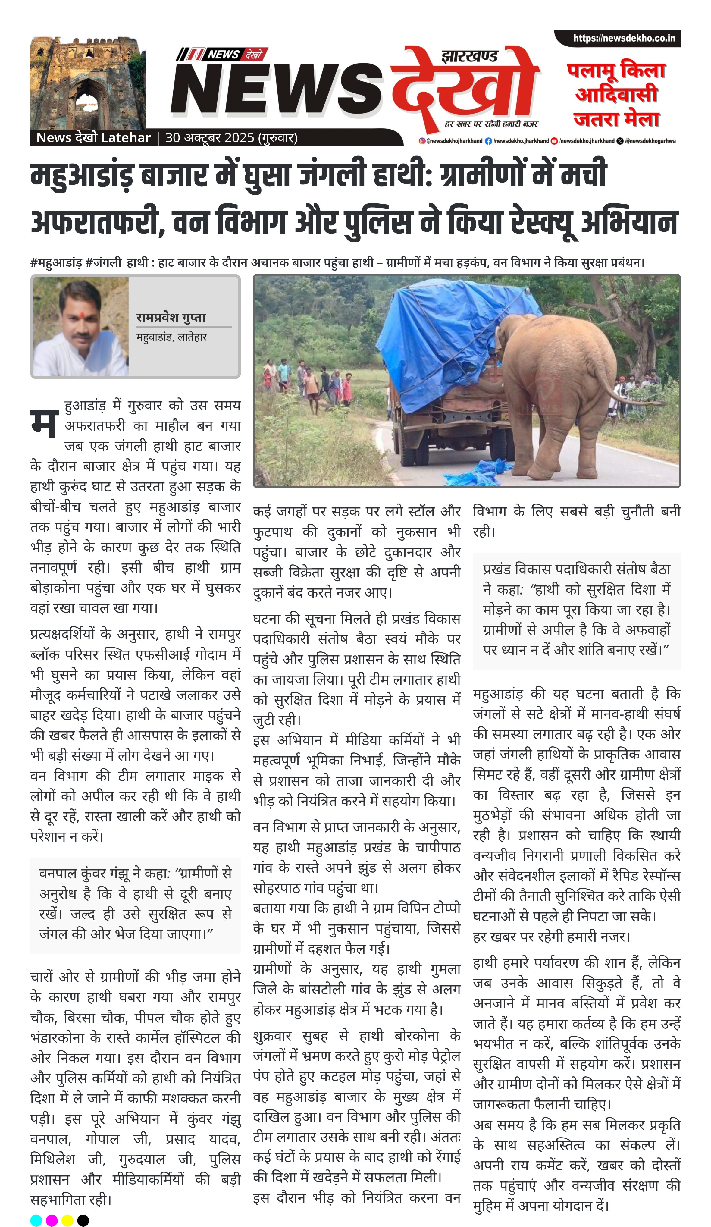 #महुआडांड़ #जंगली_हाथी : हाट बाजार के दौरान अचानक बाजार पहुंचा हाथी – ग्रामीणों में मचा हड़कंप, वन विभाग ने किया सुरक्षा प्रबंधन। महुआडांड़ प्रखंड में बृहस्पतिवार को हाट बाजार के दौरान एक जंगली हाथी के आने से अफरातफरी मच गई। कुरुंद घाट से उतरकर हाथी सड़क पार करते हुए महुआडांड़ बाजार में प्रवेश कर गया। बोड़ाकोना गांव में एक घर में घुसकर चावल खा गया, और एफसीआई गोदाम में घुसने का प्रयास किया। वन विभाग और पुलिस प्रशासन की टीमों…
