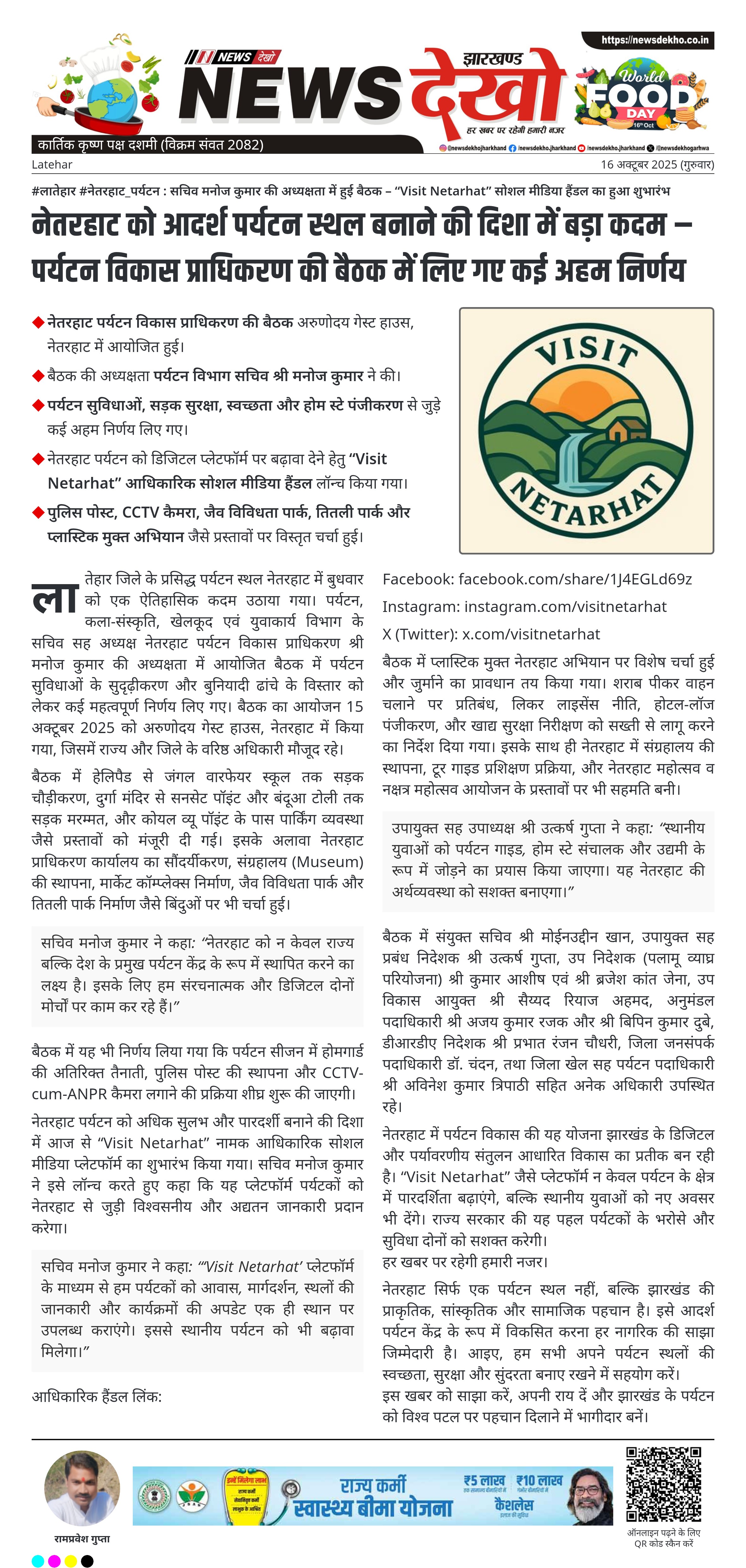 #लातेहार #नेतरहाट_पर्यटन : सचिव मनोज कुमार की अध्यक्षता में हुई बैठक – “Visit Netarhat” सोशल मीडिया हैंडल का हुआ शुभारंभ नेतरहाट पर्यटन विकास प्राधिकरण की बैठक अरुणोदय गेस्ट हाउस, नेतरहाट में आयोजित हुई। बैठक की अध्यक्षता पर्यटन विभाग सचिव श्री मनोज कुमार ने की। पर्यटन सुविधाओं, सड़क सुरक्षा, स्वच्छता और होम स्टे पंजीकरण से जुड़े कई अहम निर्णय लिए गए। नेतरहाट पर्यटन को डिजिटल प्लेटफॉर्म पर बढ़ावा देने हेतु “Visit Netarhat” आधिकारिक सोशल मीडिया हैंडल लॉन्च किया गया। पुलिस पोस्ट,…