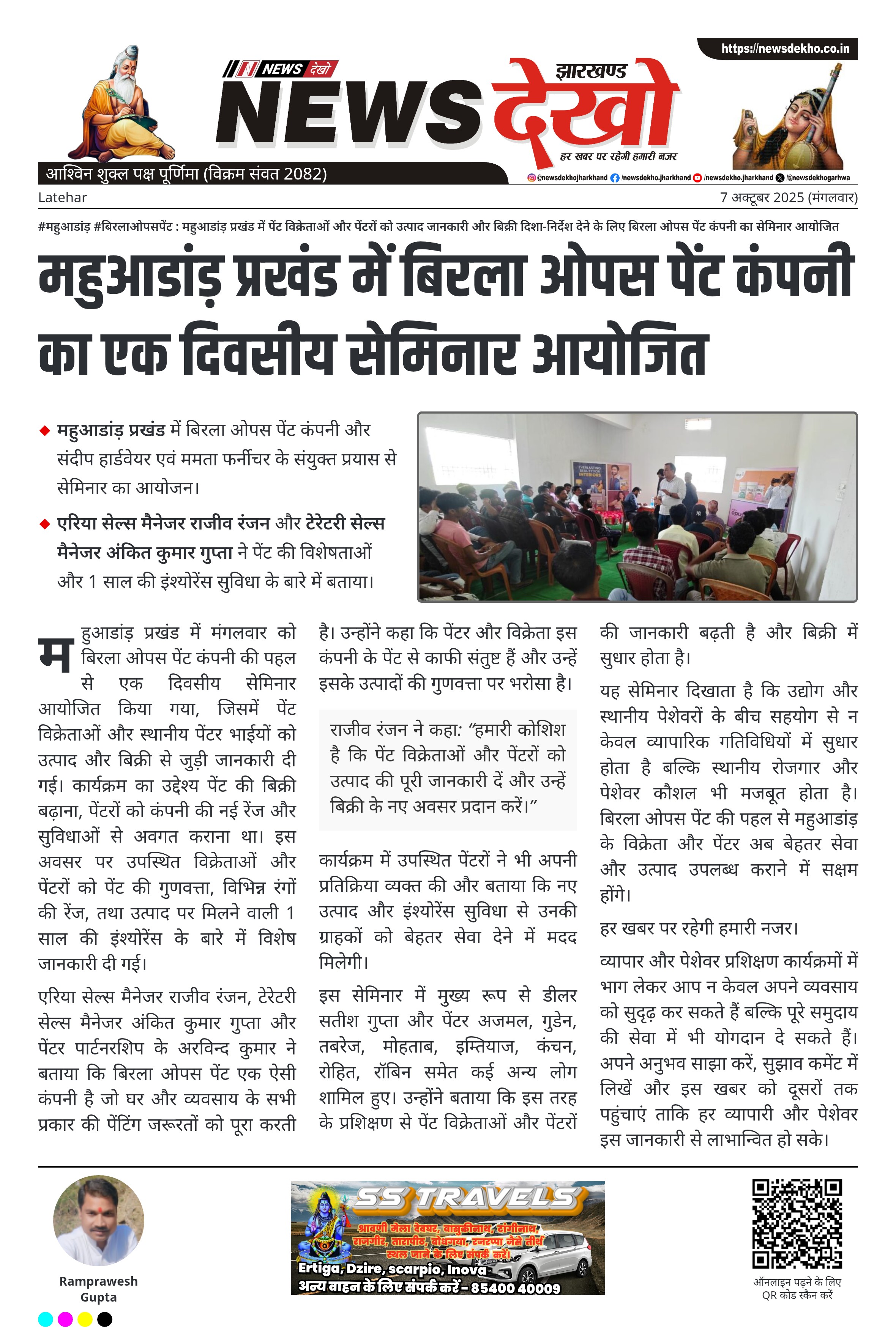 #महुआडांड़ #बिरलाओपसपेंट : महुआडांड़ प्रखंड में पेंट विक्रेताओं और पेंटरों को उत्पाद जानकारी और बिक्री दिशा-निर्देश देने के लिए बिरला ओपस पेंट कंपनी का सेमिनार आयोजित महुआडांड़ प्रखंड में बिरला ओपस पेंट कंपनी और संदीप हार्डवेयर एवं ममता फर्नीचर के संयुक्त प्रयास से सेमिनार का आयोजन। विक्रेताओं और पेंटरों को बिरला ओपस पेंट के विभिन्न उत्पादों और बिक्री दिशा-निर्देशों की जानकारी दी गई। एरिया सेल्स मैनेजर राजीव रंजन और टेरेटरी सेल्स मैनेजर अंकित कुमार गुप्ता ने पेंट की विशेषताओं और…