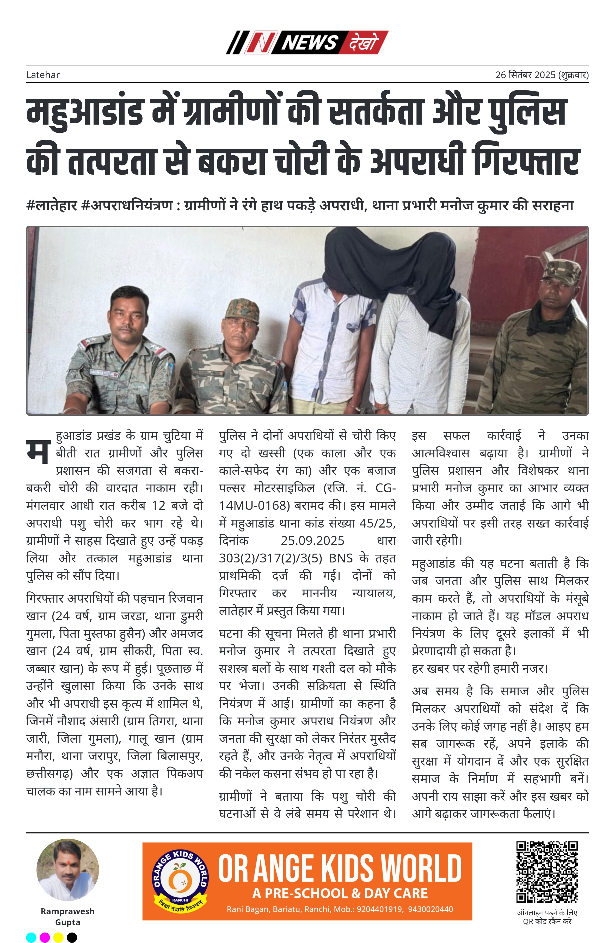 #लातेहार #अपराधनियंत्रण : ग्रामीणों ने रंगे हाथ पकड़े अपराधी, थाना प्रभारी मनोज कुमार की सराहना ग्राम चुटिया में आधी रात दो अपराधी चोरी करते हुए ग्रामीणों के हत्थे चढ़े। पकड़े गए अपराधियों की पहचान रिजवान खान और अमजद खान के रूप में हुई। अपराधियों के पास से दो खस्सी और एक बजाज पल्सर मोटरसाइकिल बरामद। मामले में कांड संख्या 45/25 के तहत प्राथमिकी दर्ज, अपराधियों को न्यायालय में पेश किया गया। थाना प्रभारी मनोज कुमार की त्वरित कार्रवाई की ग्रामीणों…