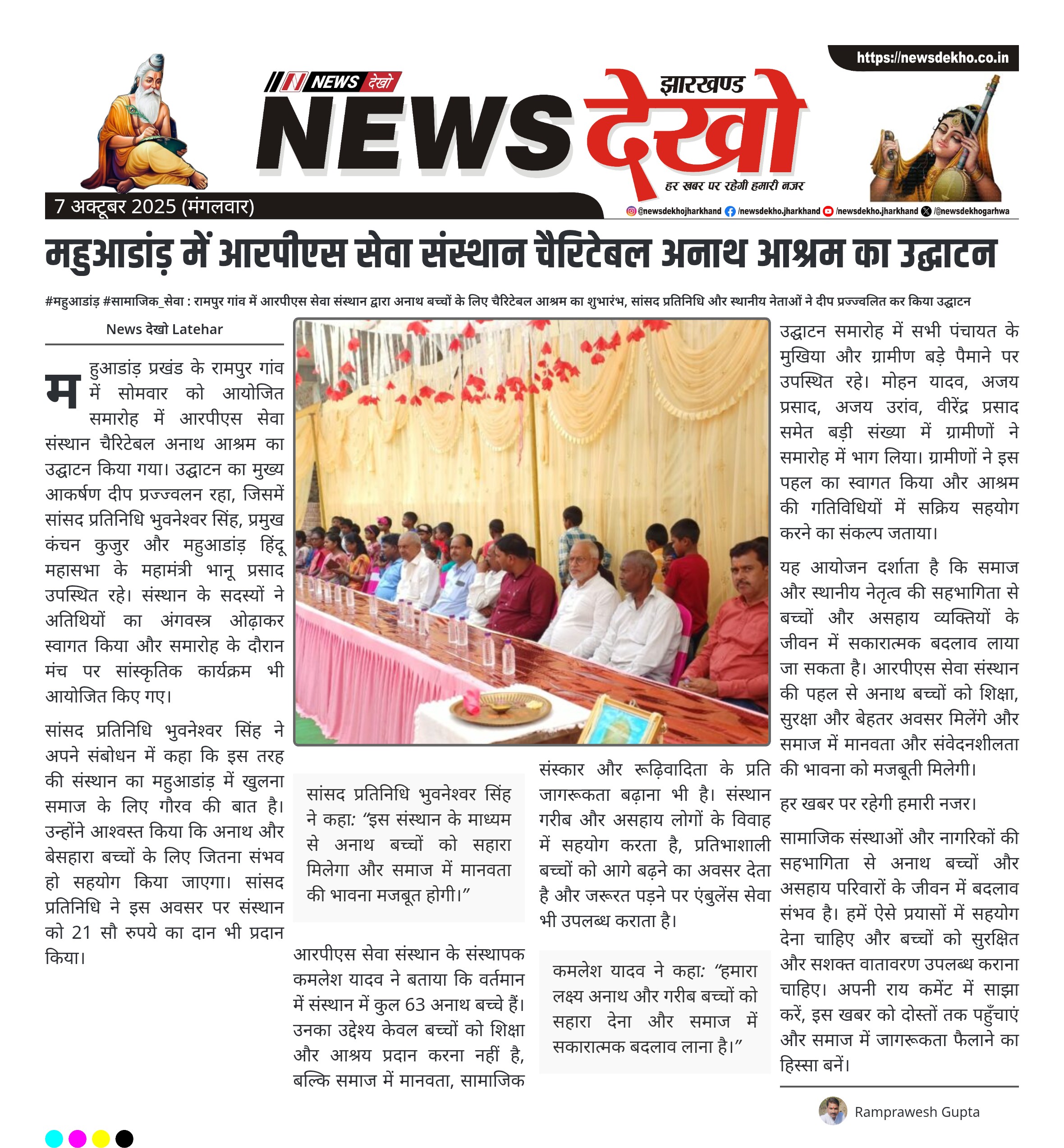 #महुआडांड़ #सामाजिक_सेवा : रामपुर गांव में आरपीएस सेवा संस्थान द्वारा अनाथ बच्चों के लिए चैरिटेबल आश्रम का शुभारंभ, सांसद प्रतिनिधि और स्थानीय नेताओं ने दीप प्रज्ज्वलित कर किया उद्घाटन महुआडांड़ प्रखंड के ग्राम रामपुर में आरपीएस सेवा संस्थान चैरिटेबल ट्रस्ट ने अनाथ आश्रम का उद्घाटन किया। मुख्य अतिथि सांसद प्रतिनिधि भुवनेश्वर सिंह और विशिष्ट अतिथि प्रमुख कंचन कुजुर एवं महुआडांड़ हिंदू महासभा महामंत्री भानू प्रसाद ने संयुक्त रूप से दीप प्रज्ज्वलित कर उद्घाटन किया। उद्घाटन समारोह में सांस्कृतिक कार्यक्रम आयोजित…
