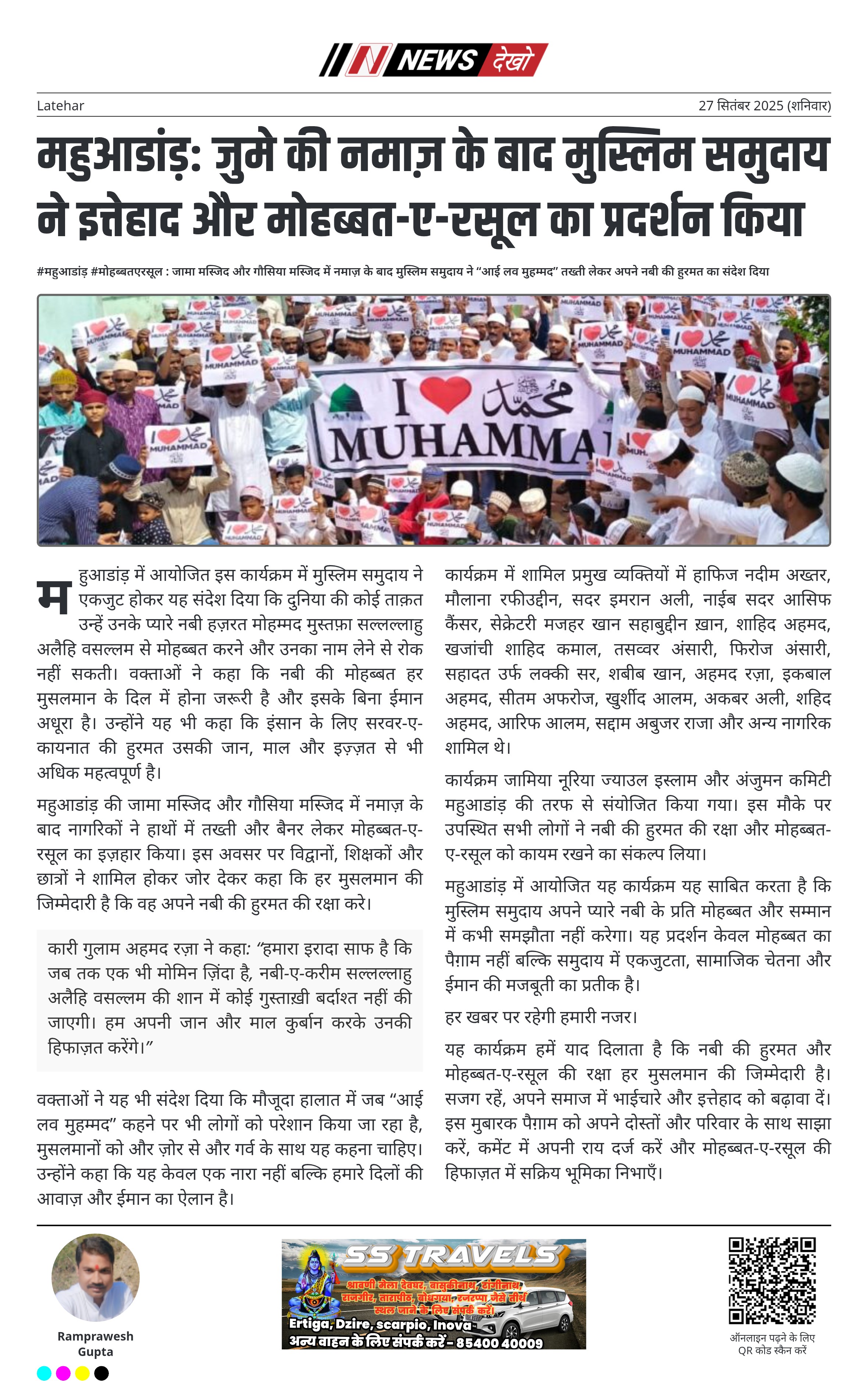 #महुआडांड़ #मोहब्बतएरसूल : जामा मस्जिद और गौसिया मस्जिद में नमाज़ के बाद मुस्लिम समुदाय ने “आई लव मुहम्मद” तख्ती लेकर अपने नबी की हुरमत का संदेश दिया महुआडांड़ जामा मस्जिद और गौसिया मस्जिद में जुमे की नमाज़ के तुरंत बाद विरोध प्रदर्शन किया गया। मुस्लिम समुदाय के लोगों ने आई लव मुहम्मद सल्लल्लाहु अलैहि वसल्लम तख्ती और बैनर हाथ में लेकर मोहब्बत-ए-रसूल का इज़हार किया। प्रदर्शन में विद्वान, शिक्षक, छात्र और आम मुसलमान शामिल हुए। वक्ताओं ने जोर देकर कहा…