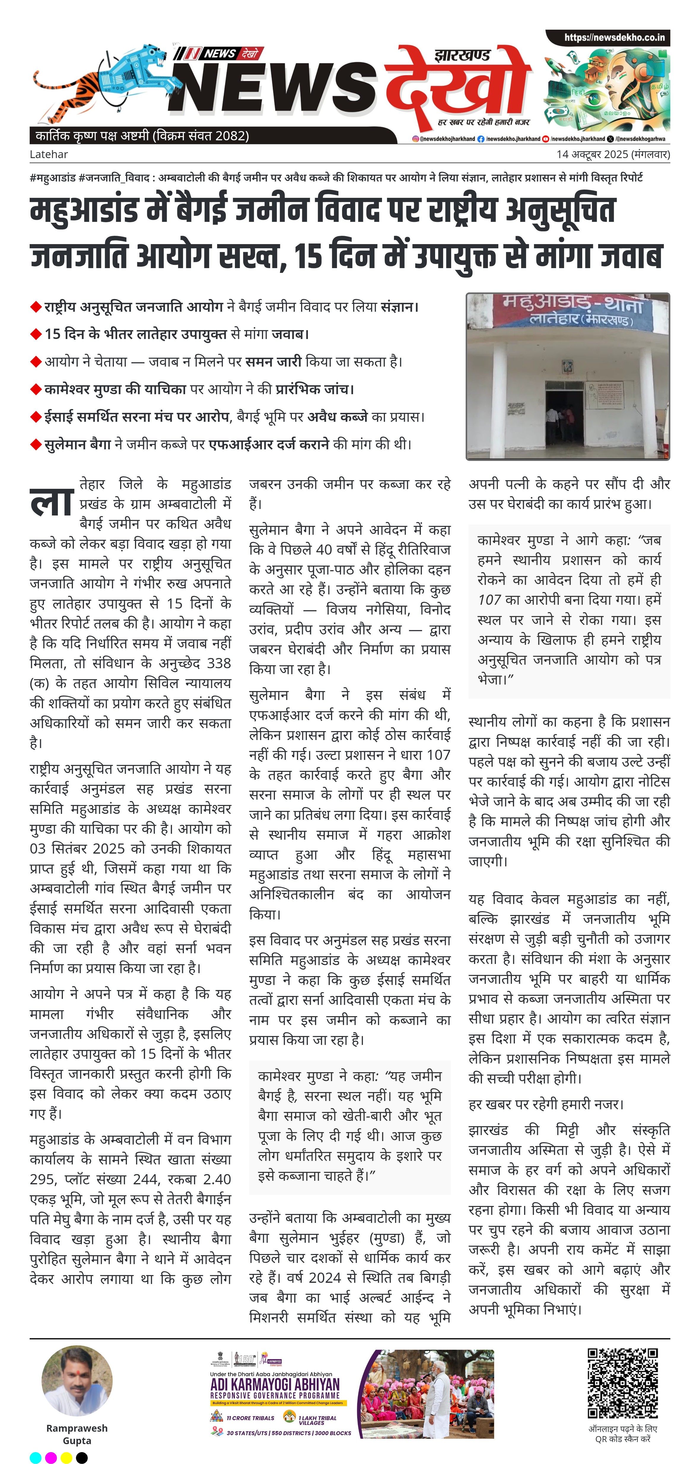 #महुआडांड #जनजाति_विवाद : अम्बवाटोली की बैगई जमीन पर अवैध कब्जे की शिकायत पर आयोग ने लिया संज्ञान, लातेहार प्रशासन से मांगी विस्तृत रिपोर्ट राष्ट्रीय अनुसूचित जनजाति आयोग ने बैगई जमीन विवाद पर लिया संज्ञान। 15 दिन के भीतर लातेहार उपायुक्त से मांगा जवाब। आयोग ने चेताया — जवाब न मिलने पर समन जारी किया जा सकता है। कामेश्वर मुण्डा की याचिका पर आयोग ने की प्रारंभिक जांच। ईसाई समर्थित सरना मंच पर आरोप, बैगई भूमि पर अवैध कब्जे का प्रयास।…