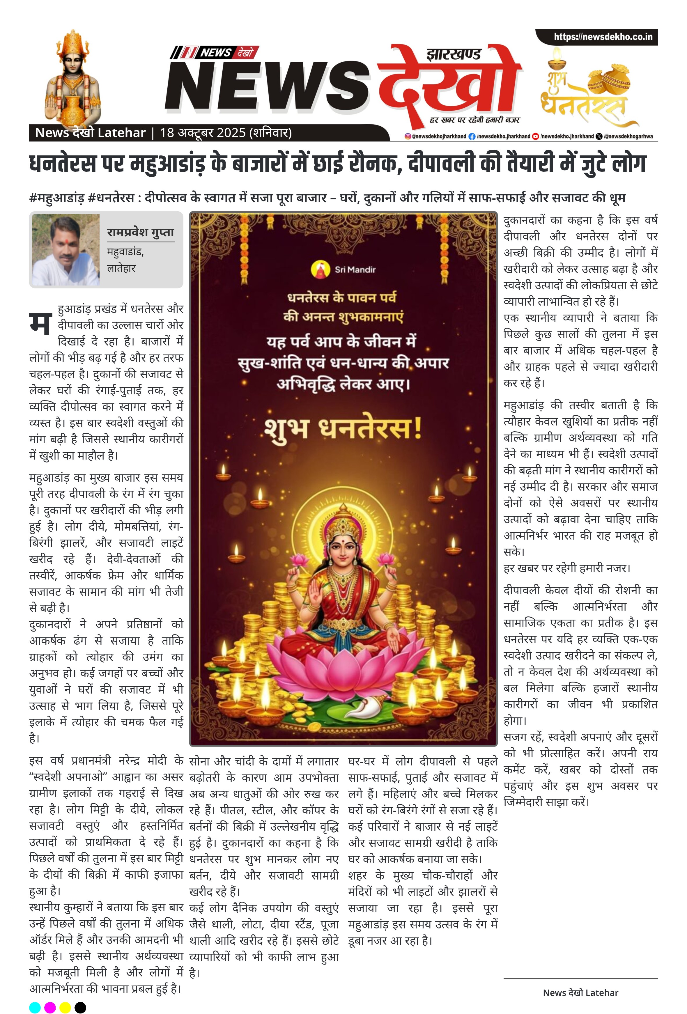 #महुआडांड़ #धनतेरस : दीपोत्सव के स्वागत में सजा पूरा बाजार – घरों, दुकानों और गलियों में साफ-सफाई और सजावट की धूम धनतेरस और दीपावली को लेकर बाजारों में खरीदारी का उत्साह चरम पर। लोग घर-दुकानों की सफाई, रंग-रोगन और सजावट में जुटे। मिट्टी के दीये, रंगीन लाइटें और देवी-देवताओं की तस्वीरें खूब बिक रही हैं। सोना-चांदी महंगे होने से पीतल और स्टील के बर्तनों की मांग में इजाफा। स्वदेशी वस्तुओं की खरीदारी बढ़ने से स्थानीय कारीगरों और कुम्हारों को लाभ।…