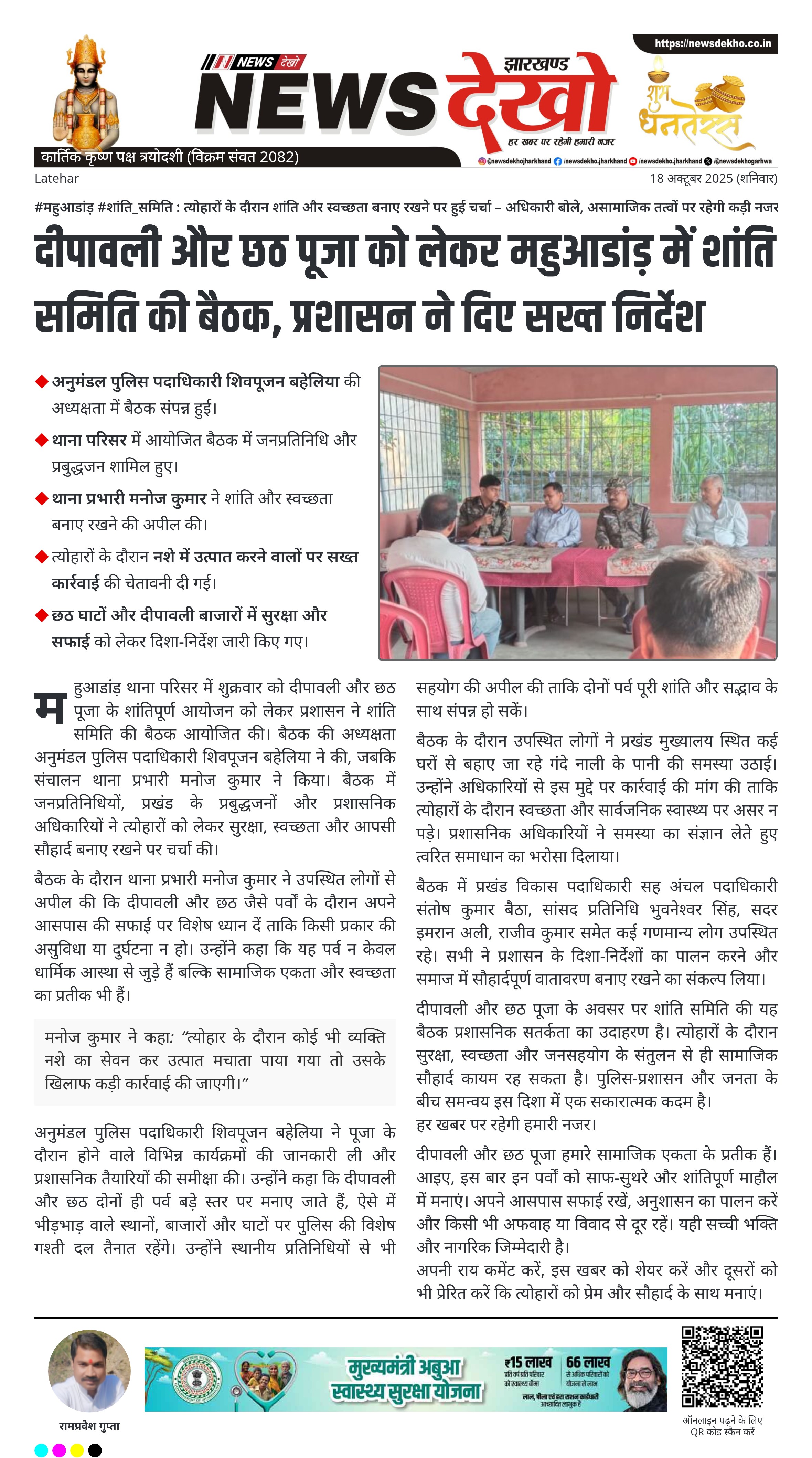 #महुआडांड़ #शांति_समिति : त्योहारों के दौरान शांति और स्वच्छता बनाए रखने पर हुई चर्चा – अधिकारी बोले, असामाजिक तत्वों पर रहेगी कड़ी नजर अनुमंडल पुलिस पदाधिकारी शिवपूजन बहेलिया की अध्यक्षता में बैठक संपन्न हुई। थाना परिसर में आयोजित बैठक में जनप्रतिनिधि और प्रबुद्धजन शामिल हुए। थाना प्रभारी मनोज कुमार ने शांति और स्वच्छता बनाए रखने की अपील की। त्योहारों के दौरान नशे में उत्पात करने वालों पर सख्त कार्रवाई की चेतावनी दी गई। छठ घाटों और दीपावली बाजारों में सुरक्षा…