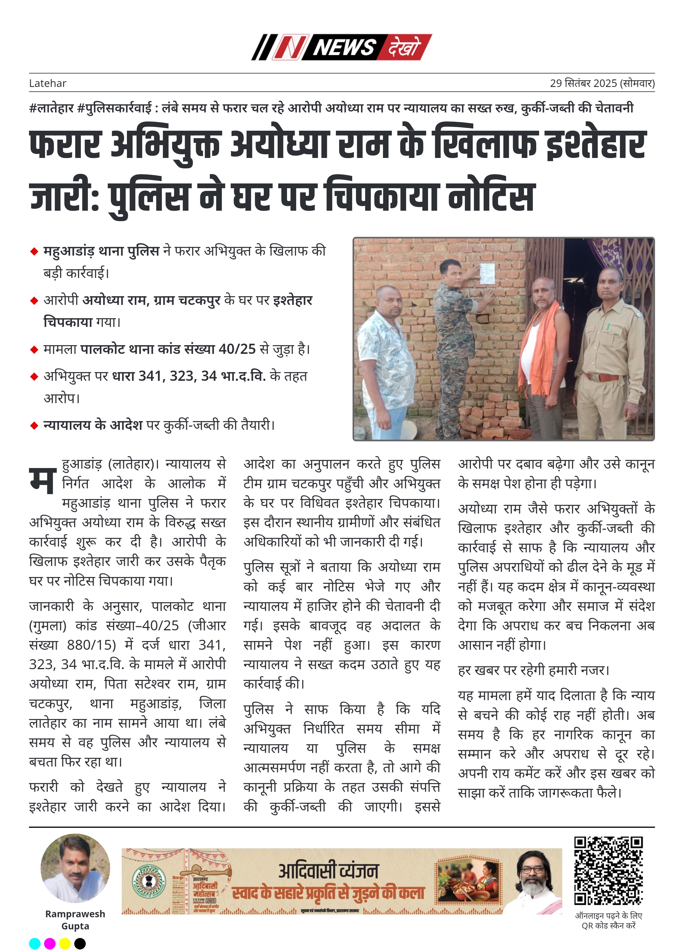 #लातेहार #पुलिसकार्रवाई : लंबे समय से फरार चल रहे आरोपी अयोध्या राम पर न्यायालय का सख्त रुख, कुर्की-जब्ती की चेतावनी महुआडांड़ थाना पुलिस ने फरार अभियुक्त के खिलाफ की बड़ी कार्रवाई। आरोपी अयोध्या राम, ग्राम चटकपुर के घर पर इश्तेहार चिपकाया गया। मामला पालकोट थाना कांड संख्या 40/25 से जुड़ा है। अभियुक्त पर धारा 341, 323, 34 भा.द.वि. के तहत आरोप। न्यायालय के आदेश पर कुर्की-जब्ती की तैयारी। महुआडांड़ (लातेहार)। न्यायालय से निर्गत आदेश के आलोक में महुआडांड़ थाना पुलिस…