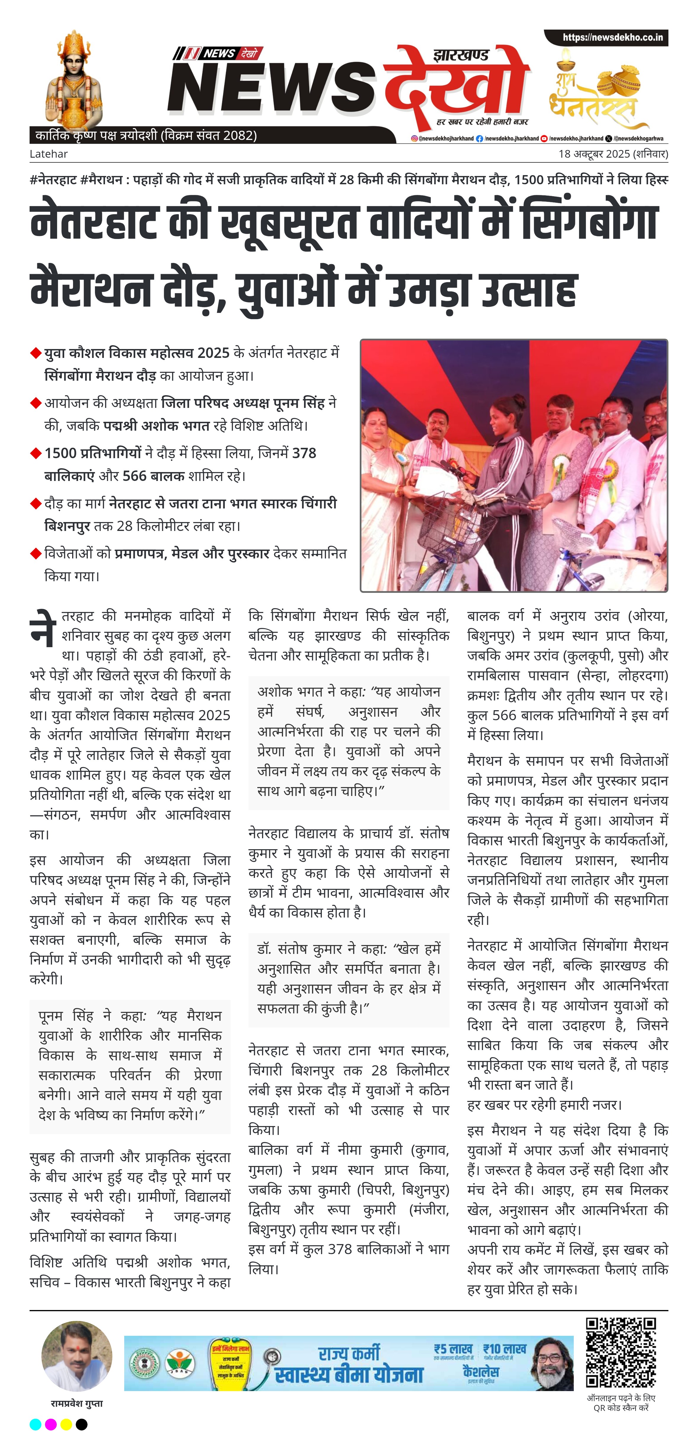 #नेतरहाट #मैराथन : पहाड़ों की गोद में सजी प्राकृतिक वादियों में 28 किमी की सिंगबोंगा मैराथन दौड़, 1500 प्रतिभागियों ने लिया हिस्सा युवा कौशल विकास महोत्सव 2025 के अंतर्गत नेतरहाट में सिंगबोंगा मैराथन दौड़ का आयोजन हुआ। आयोजन की अध्यक्षता जिला परिषद अध्यक्ष पूनम सिंह ने की, जबकि पद्मश्री अशोक भगत रहे विशिष्ट अतिथि। 1500 प्रतिभागियों ने दौड़ में हिस्सा लिया, जिनमें 378 बालिकाएं और 566 बालक शामिल रहे। दौड़ का मार्ग नेतरहाट से जतरा टाना भगत स्मारक चिंगारी बिशनपुर…