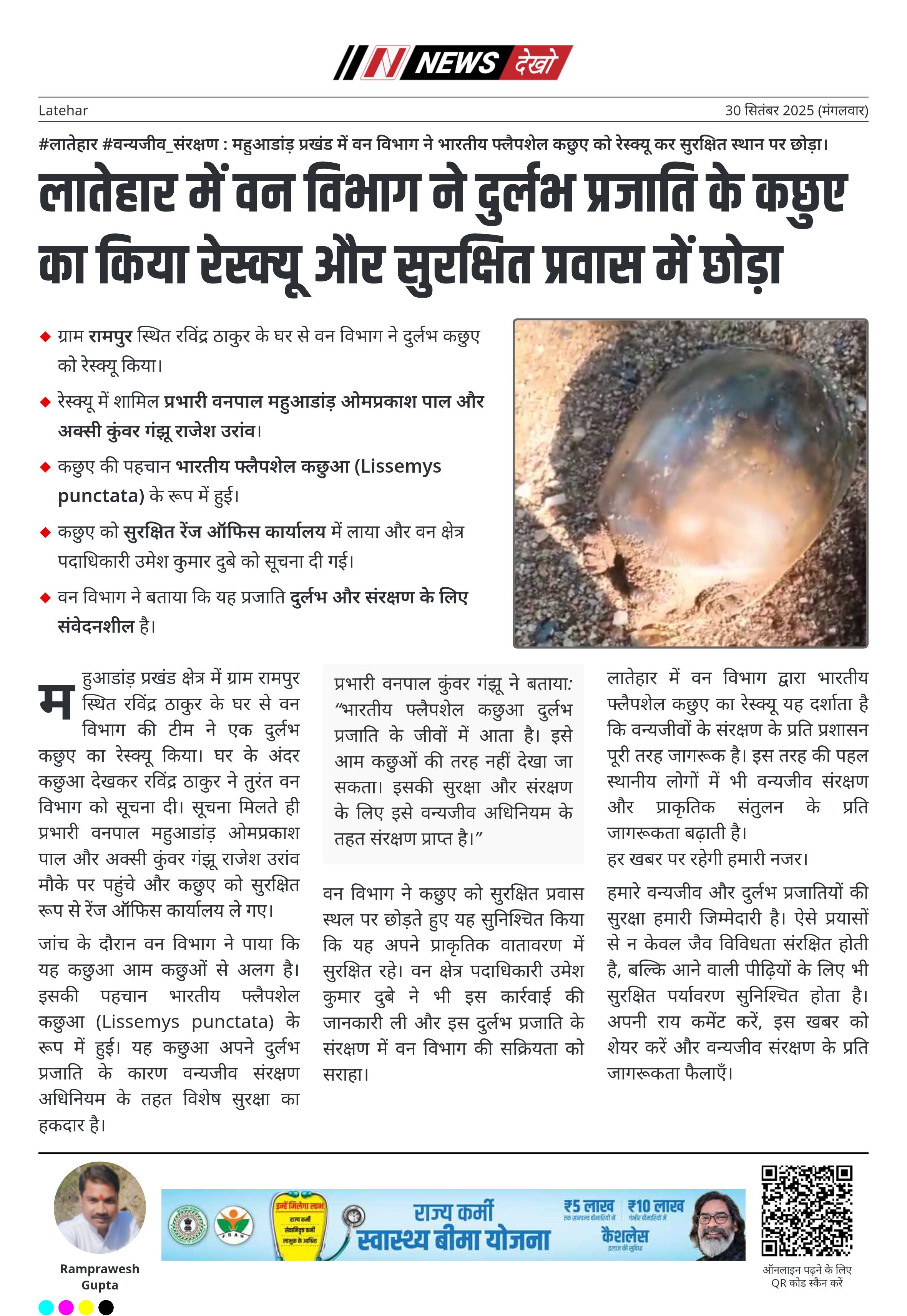 #लातेहार #वन्यजीव_संरक्षण : महुआडांड़ प्रखंड में वन विभाग ने भारतीय फ्लैपशेल कछुए को रेस्क्यू कर सुरक्षित स्थान पर छोड़ा। ग्राम रामपुर स्थित रविंद्र ठाकुर के घर से वन विभाग ने दुर्लभ कछुए को रेस्क्यू किया। रेस्क्यू में शामिल प्रभारी वनपाल महुआडांड़ ओमप्रकाश पाल और अक्सी कुंवर गंझू राजेश उरांव। कछुए की पहचान भारतीय फ्लैपशेल कछुआ (Lissemys punctata) के रूप में हुई। कछुए को सुरक्षित रेंज ऑफिस कार्यालय में लाया और वन क्षेत्र पदाधिकारी उमेश कुमार दुबे को सूचना दी गई।…