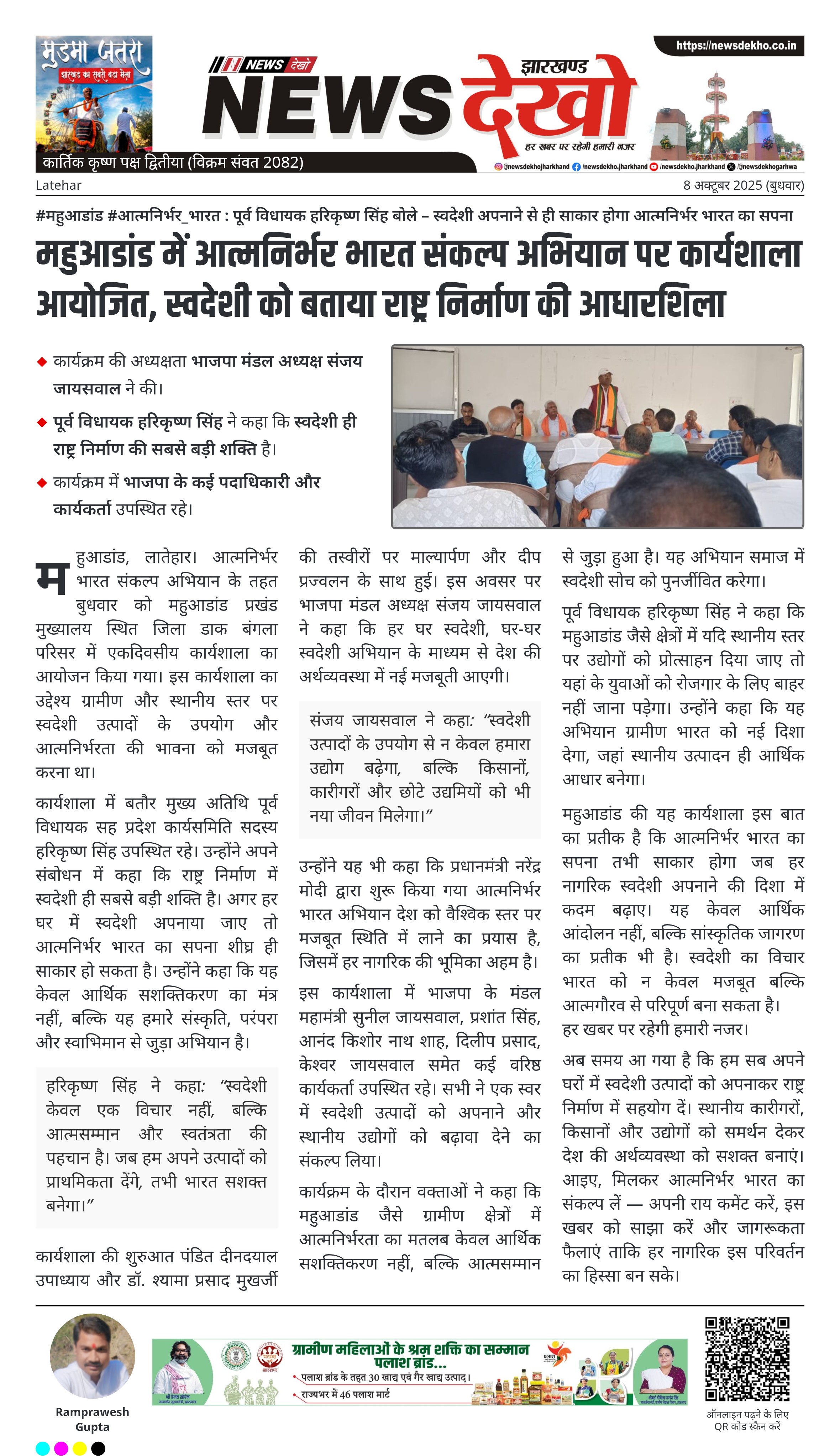 #महुआडांड #आत्मनिर्भर_भारत : पूर्व विधायक हरिकृष्ण सिंह बोले – स्वदेशी अपनाने से ही साकार होगा आत्मनिर्भर भारत का सपना आत्मनिर्भर भारत संकल्प अभियान पर महुआडांड डाक बंगला में एकदिवसीय कार्यशाला का आयोजन हुआ। कार्यक्रम की अध्यक्षता भाजपा मंडल अध्यक्ष संजय जायसवाल ने की। पूर्व विधायक हरिकृष्ण सिंह ने कहा कि स्वदेशी ही राष्ट्र निर्माण की सबसे बड़ी शक्ति है। कार्यशाला का शुभारंभ पंडित दीनदयाल उपाध्याय और डॉ. श्यामा प्रसाद मुखर्जी की प्रतिमा पर पुष्पांजलि और दीप प्रज्वलन से हुआ। कार्यक्रम…