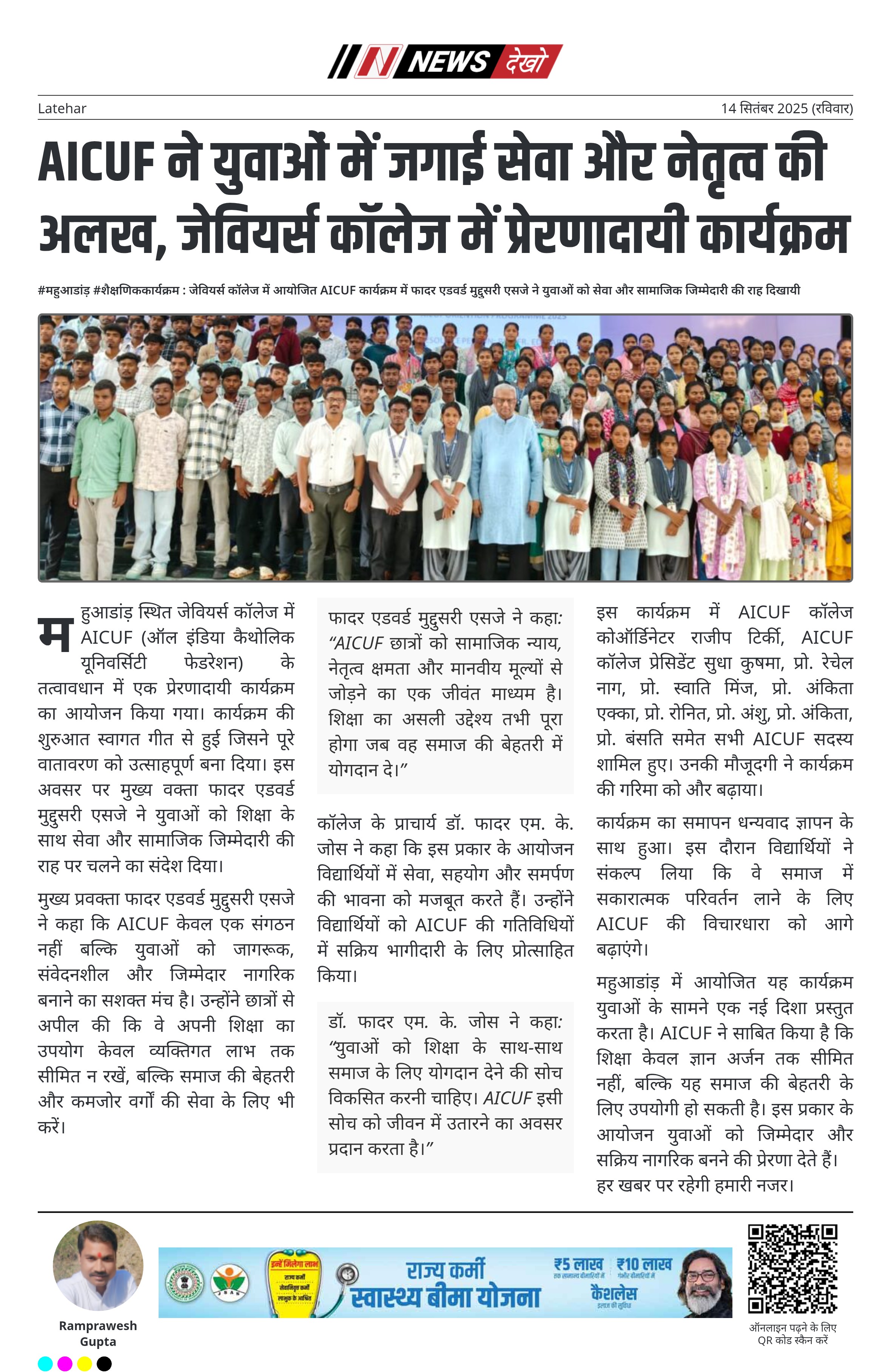 AICUF ने युवाओं में जगाई सेवा और नेतृत्व की अलख, जेवियर्स कॉलेज में प्रेरणादायी कार्यक्रम