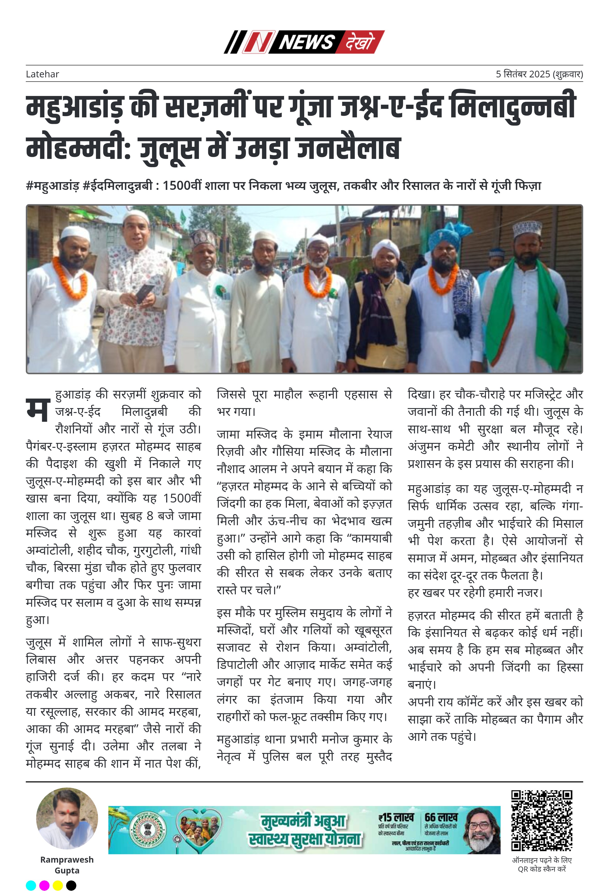 #महुआडांड़ #ईदमिलादुन्नबी : 1500वीं शाला पर निकला भव्य जुलूस, तकबीर और रिसालत के नारों से गूंजी फिज़ा महुआडांड़ में पूरे शान-ओ-शौकत से निकाला गया जुलूस-ए-मोहम्मदी। इस वर्ष का जुलूस 1500वीं शाला होने के कारण रहा खास। “सरकार की आमद मरहबा, आका की आमद मरहबा” नारों से फिज़ा गूंज उठी। मौलाना रेयाज रिज़वी और नौशाद आलम ने हज़रत मोहम्मद साहब की शिक्षाओं पर दिया जोर। मस्जिदों, घरों और गलियों को सजाया गया, जगह-जगह लंगर व तक्सीम-ए-फल। प्रशासन की चाक-चौबंद सुरक्षा, पूरे…