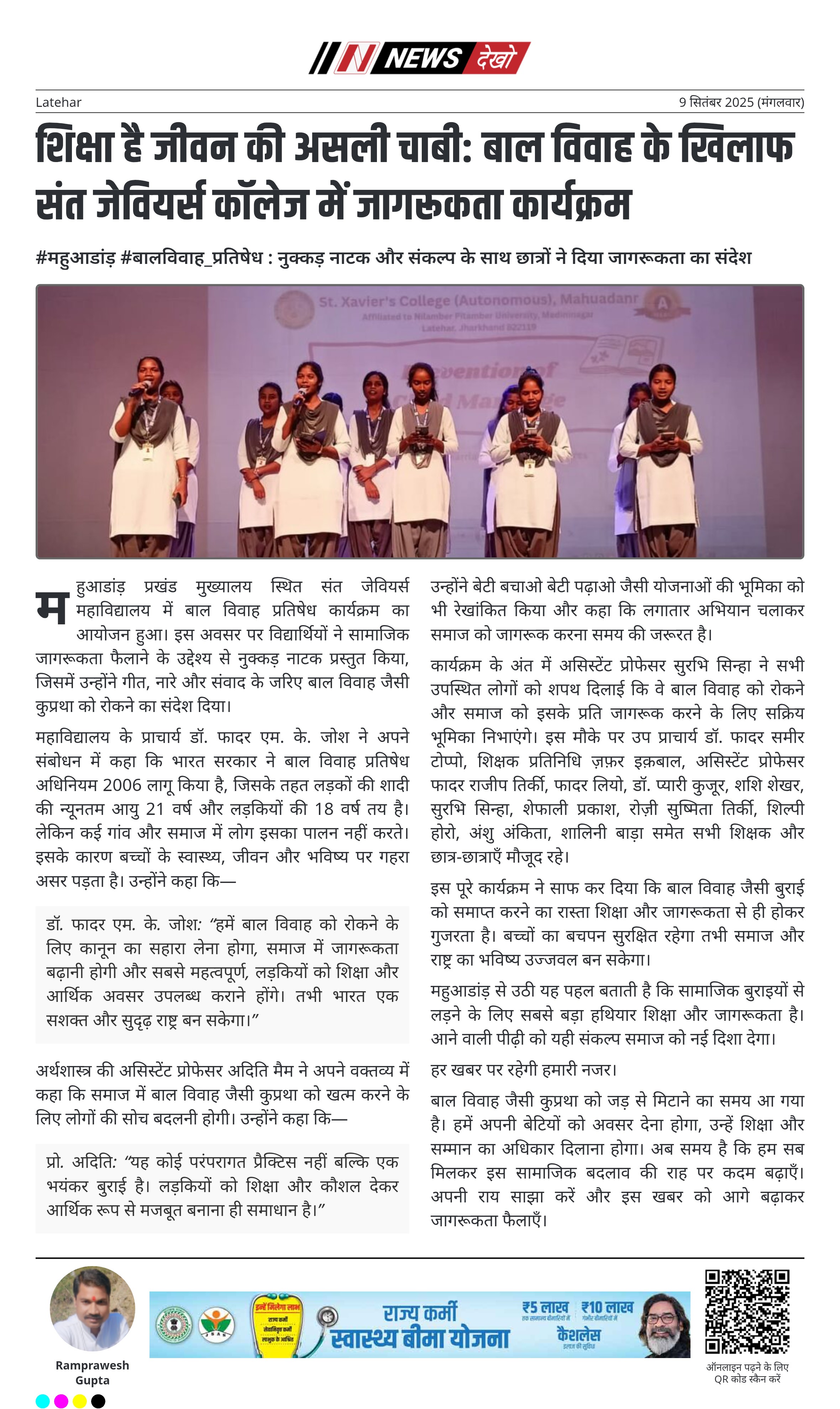 शिक्षा है जीवन की असली चाबी: बाल विवाह के खिलाफ संत जेवियर्स कॉलेज में जागरूकता कार्यक्रम