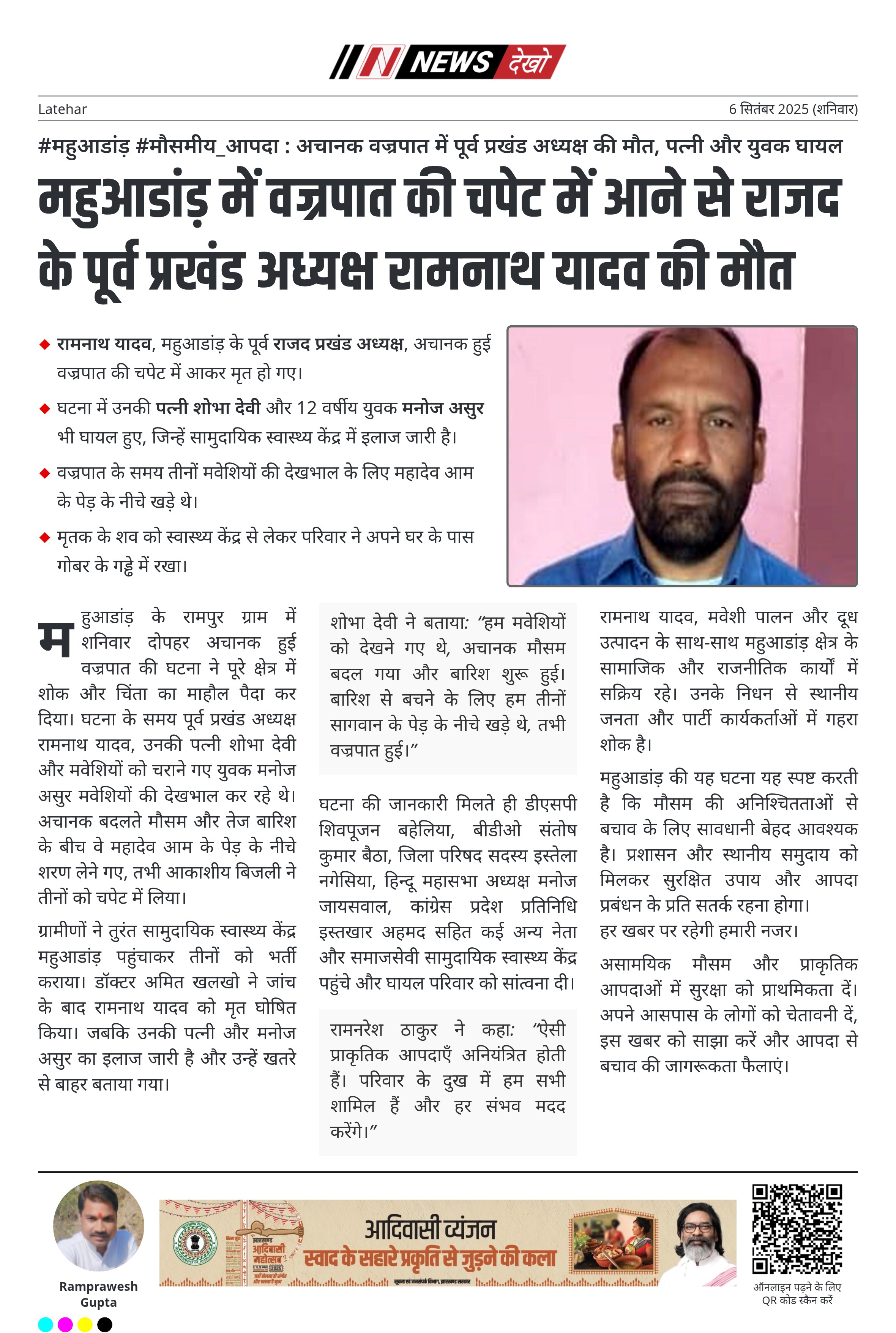 महुआडांड़ में वज्रपात की चपेट में आने से राजद के पूर्व प्रखंड अध्यक्ष रामनाथ यादव की मौत