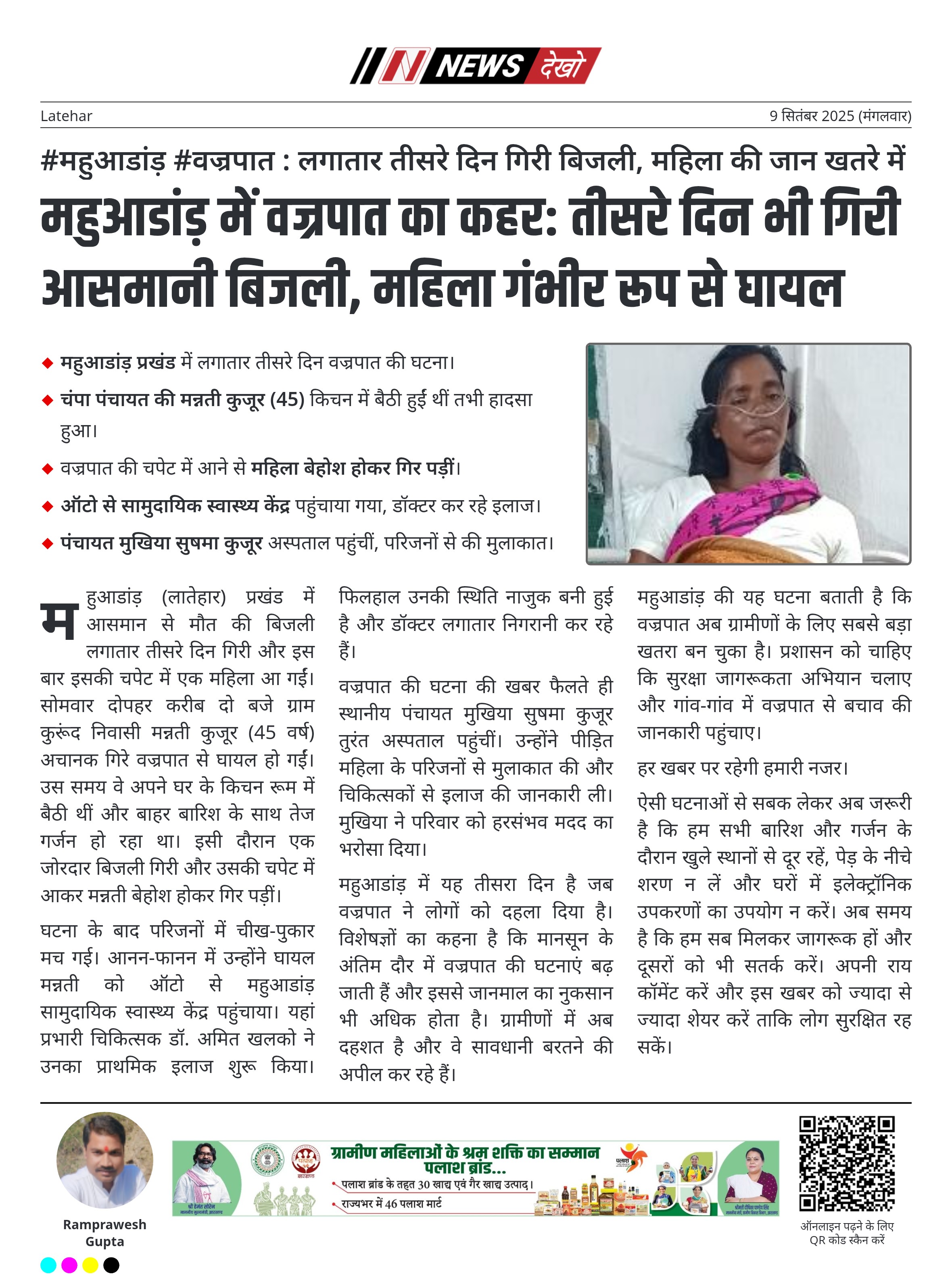 महुआडांड़ में वज्रपात का कहर: तीसरे दिन भी गिरी आसमानी बिजली, महिला गंभीर रूप से घायल